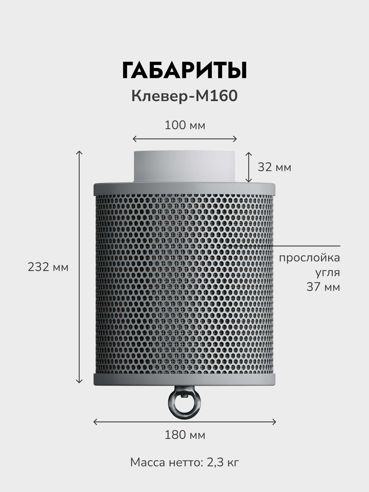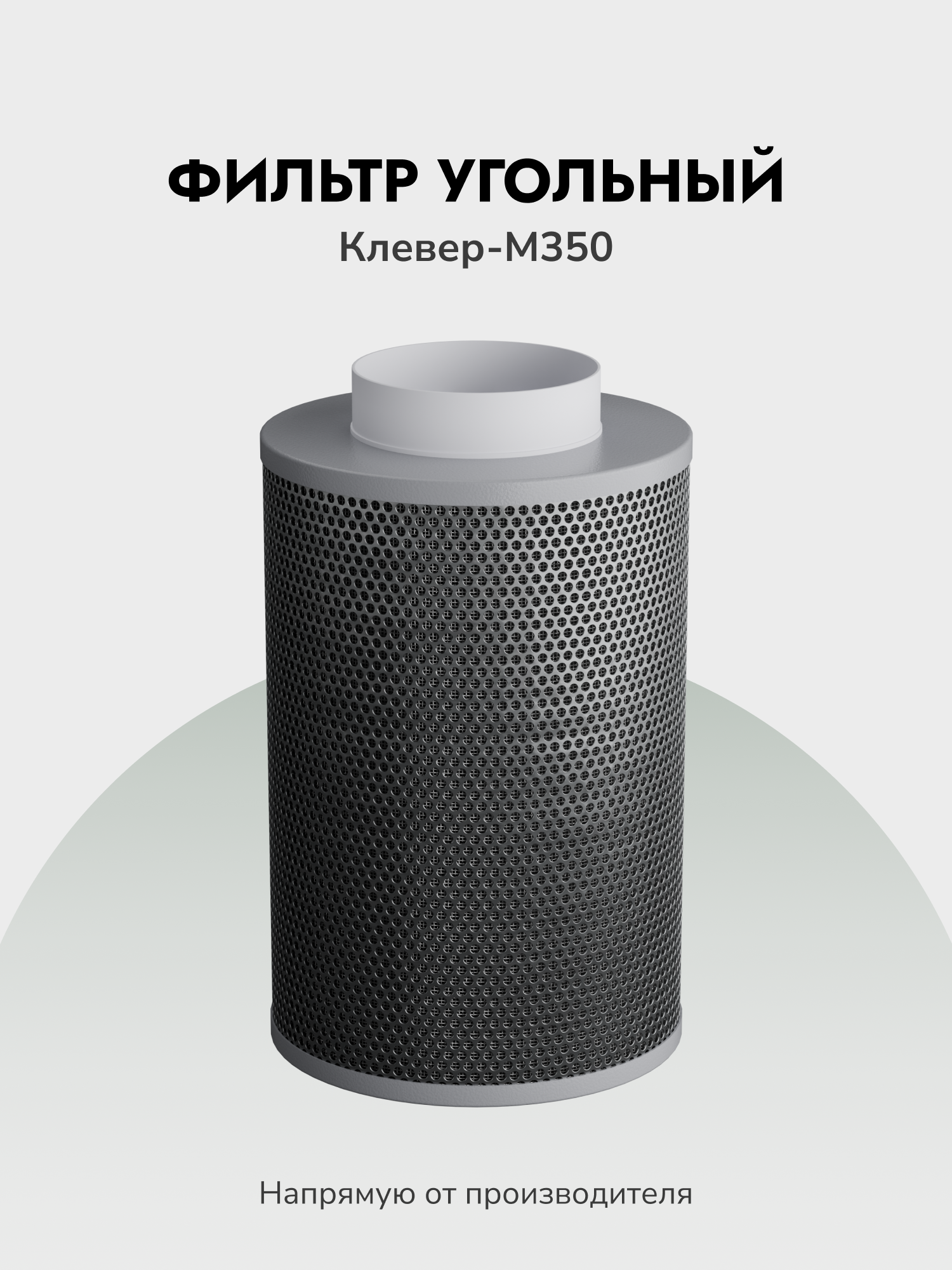 Характеристики Фильтра КЛЕВЕР-М350: Производительность вентилятора до 350м3/час, Диаметр патрубка/ Диаметр корпуса/ Высота фильтра с патрубком (мм) - 125/215/252 Количество угля (кг/литров) - 3,45/6,9 Вес фильтра (кг) - 4,5* (Вес может незначительно изменяться в зависимости от влажности окружающего воздуха и партии угля)
