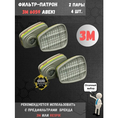 Cменный патрон (фильтр) 3M 6059 ( АВЕК1 ) 2 пары фильтров 4 штуки, угольный, трапецивидной формы с надежным байонетным креплением, позволяющим быстро устанавливать фильтры на полную маску или полумаску. Комплект на одну маску состоит из 2 шт (1 пара).