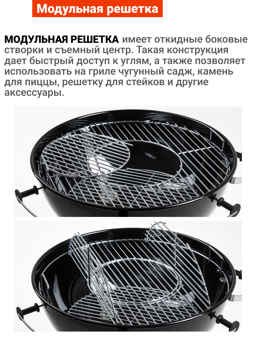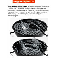 - Модульная конструкция рабочей решетки дает быстрый доступ к углям в жаровне, а также позволяет использовать на гриле чугунный садж, камень для пиццы, решетку для стейков и другие аксессуары;