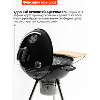 Новинка коллекции: классический угольный гриль премиальной серии превратит процесс гриллинга в настоящее удовольствие, тем более что у данной модели в комплектации LUX на жаровне предусмотрен специальный кронштейн, позволяющий сдвигать вбок крышку гриля и надежно фиксировать ее там, быстро освобождая руки для любых операций с продуктом в каждый момент. Удобно, что у гриля есть съемный деревянный столик, на котором можно разместить все необходимое для жарки. Новая модульная грилевая решетка имеет откидные боковые створки и съемный центр - это дает быстрый доступ к углям в жаровне, а также позволяет использовать на гриле чугунный садж, камень для пиццы, решетку для стейков и другие аксессуары.