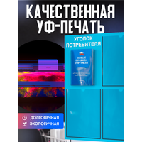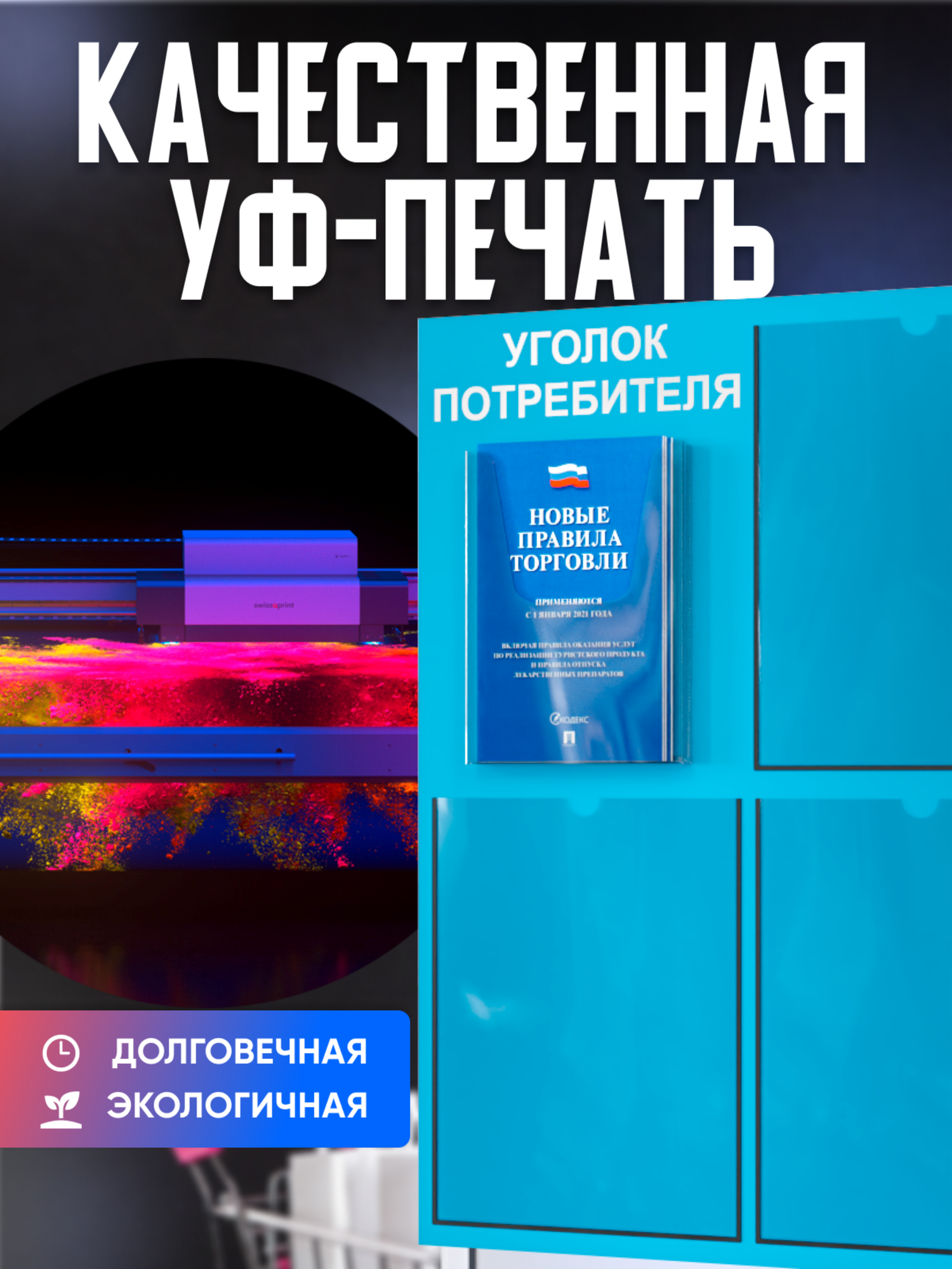 Стенд изготовлен из качественного пластика ПВХ толщиной 3 мм, что обеспечивает его устойчивость к влаге и выгоранию. Благодаря этому, уголок потребителя будет служить вам долгое время, сохраняя свой первоначальный вид.