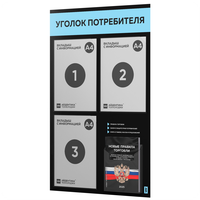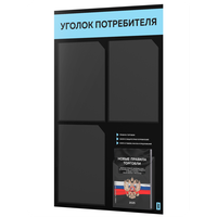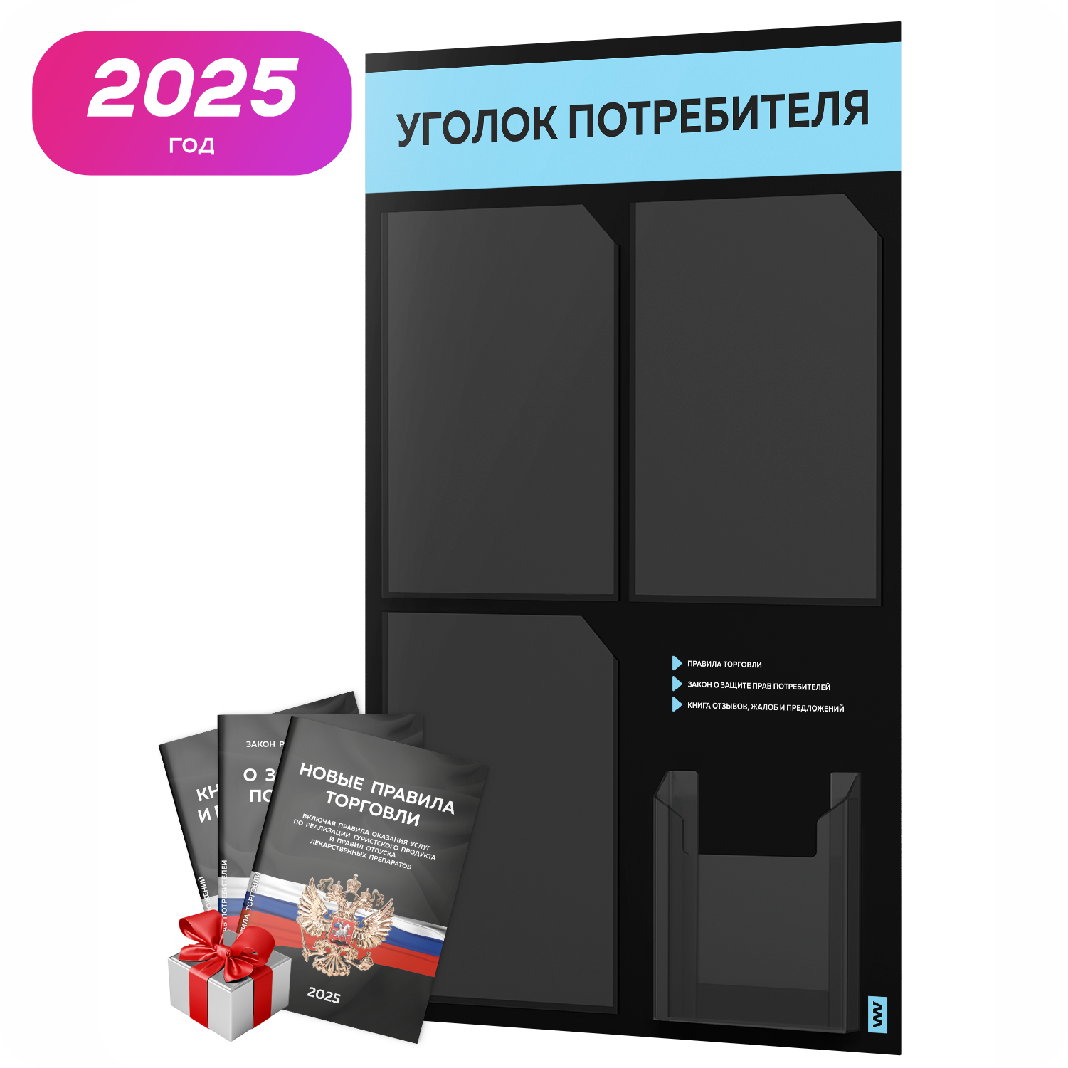 Уголок потребителя 2025 + черный комплект книг 2025, черный стенд с голубым, 4 кармана, 2х2, серия Black Color, Айдентика Технолоджи: сравнение цен, характеристики, фото, актуальное наличие и цены.