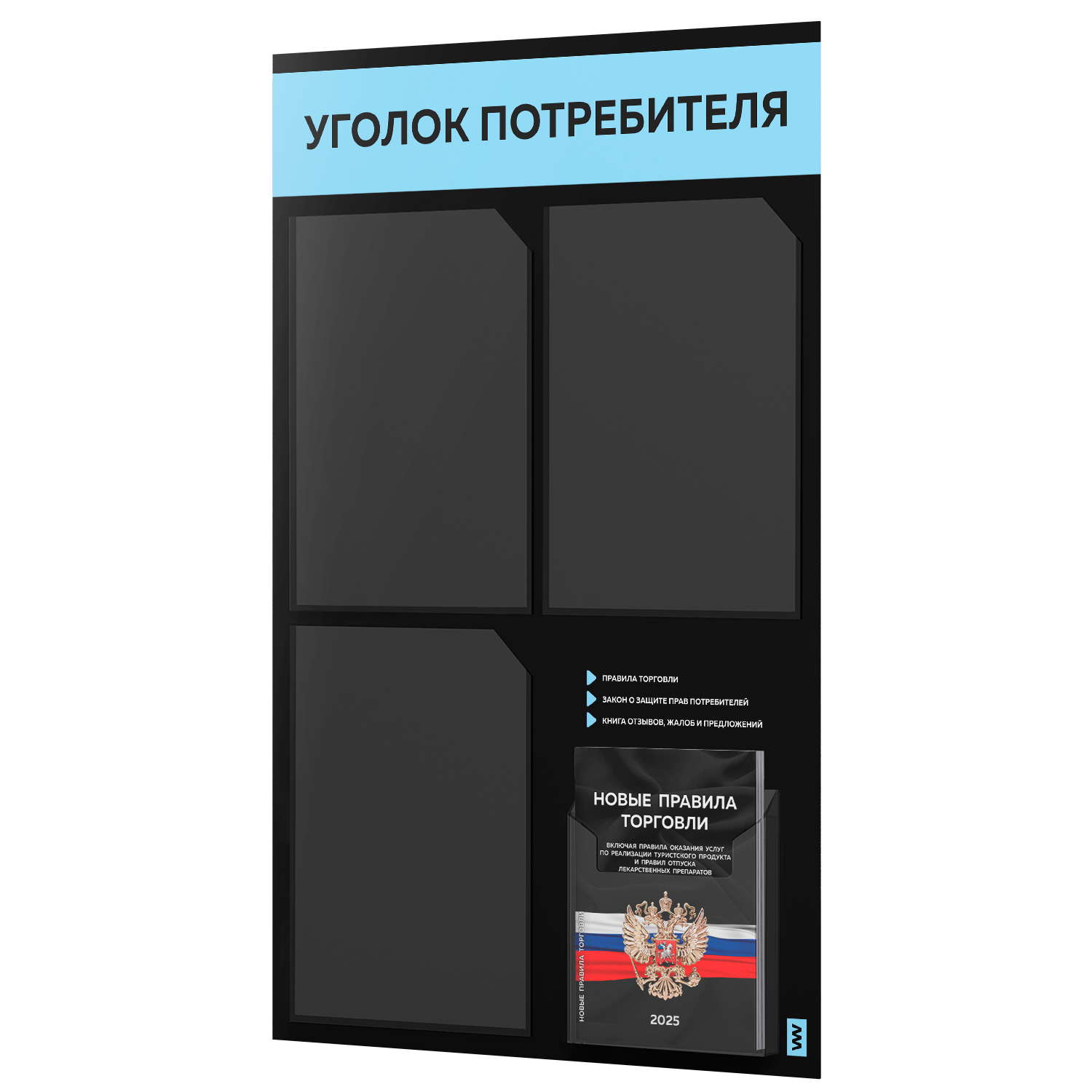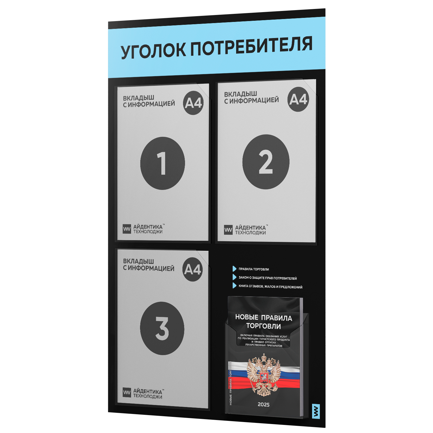 Купить Уголок потребителя 2025 + черный комплект книг 2025, черный стенд с голубым, 4 кармана, 2х2, серия Black Color, Айдентика Технолоджи с доставкой по всей России.