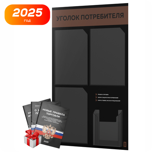 Уголок потребителя 2025 + черный комплект книг 2025, черный стенд с коричневым, 4 кармана, 2х2, серия Black Color, Айдентика Технолоджи: сравнение цен, характеристики, фото, актуальное наличие и цены.