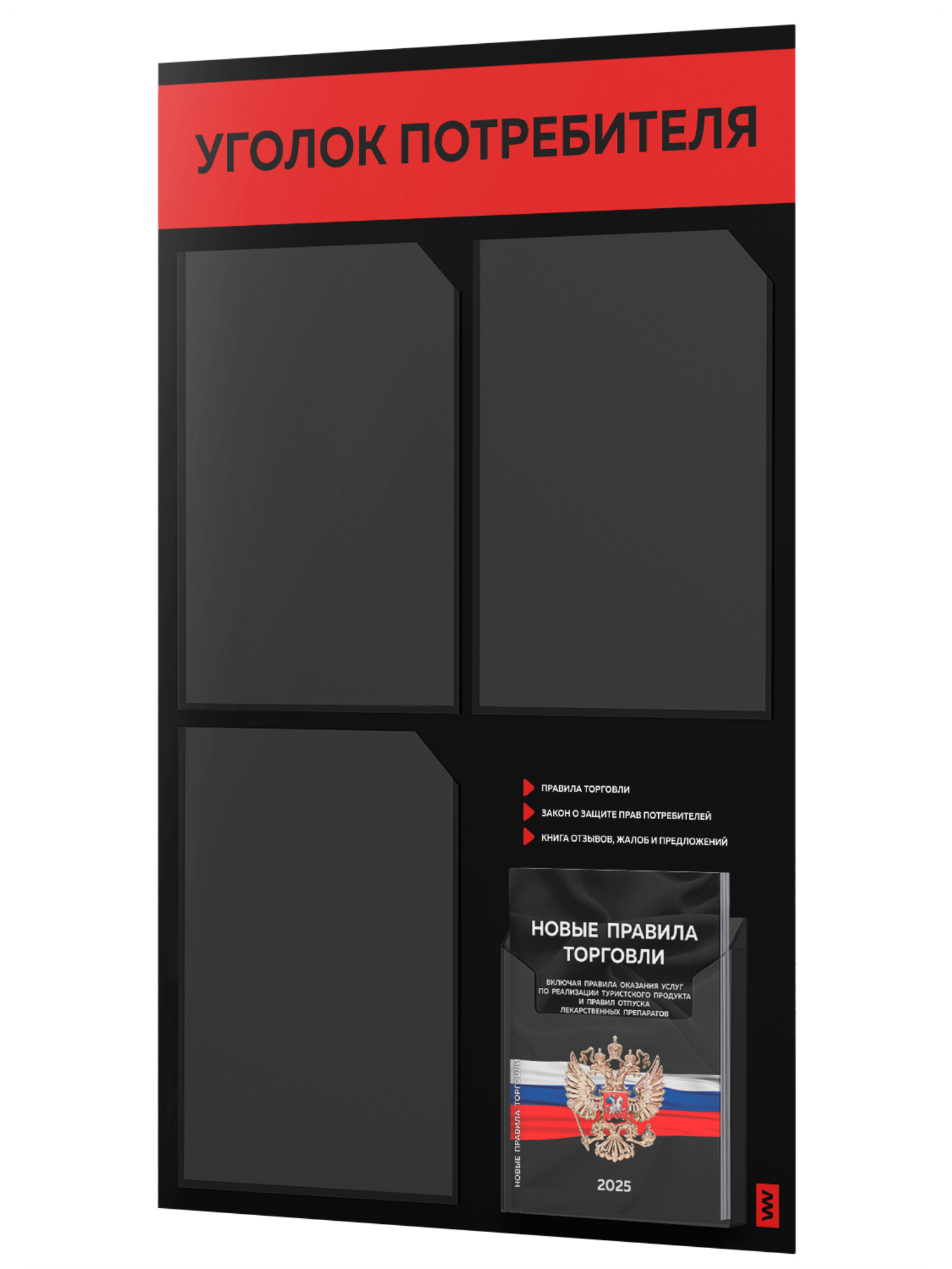 Купить Уголок потребителя 2025 + черный комплект книг 2025, черный стенд с красным, 4 кармана, 2х2, серия Black Color, Айдентика Технолоджи с доставкой по всей России.