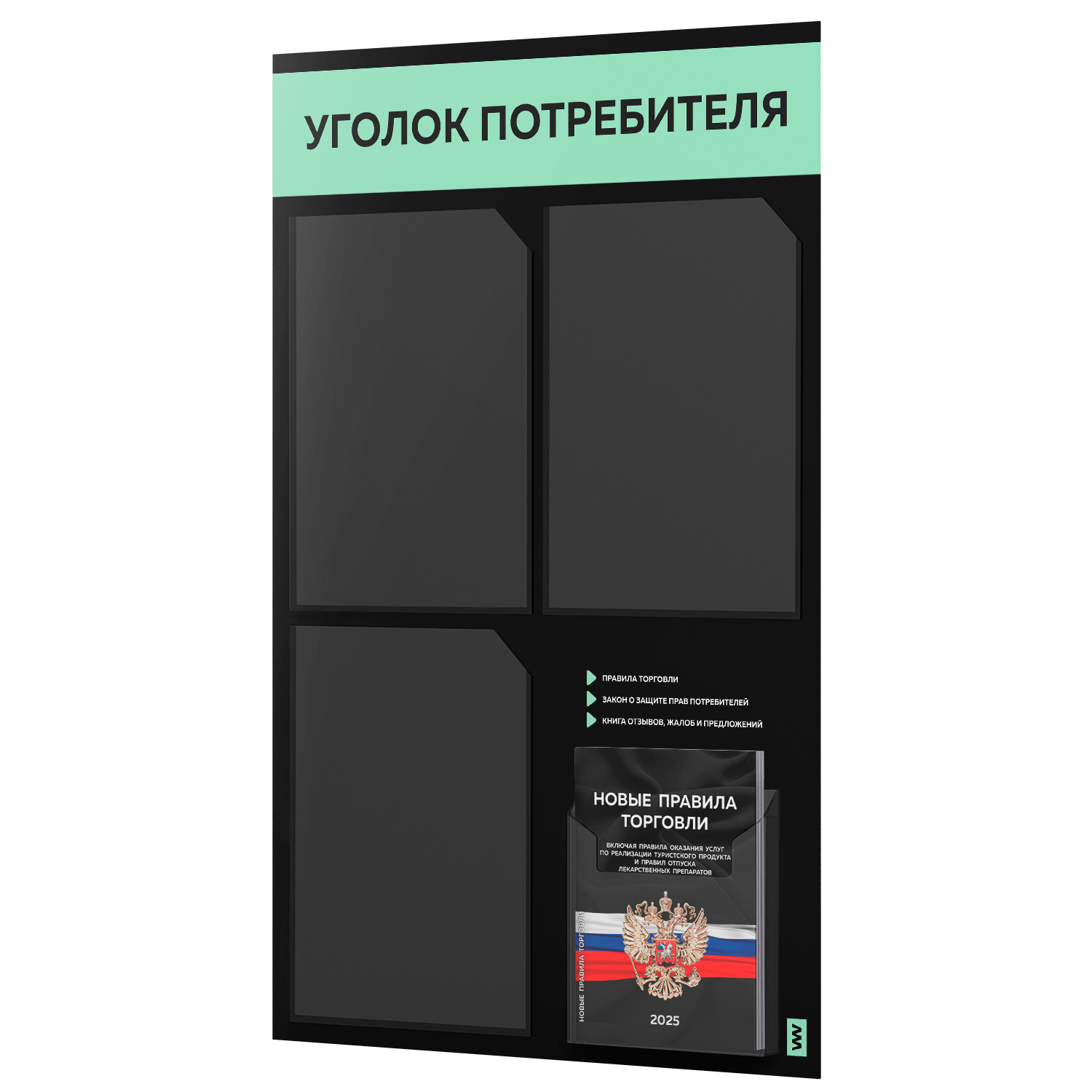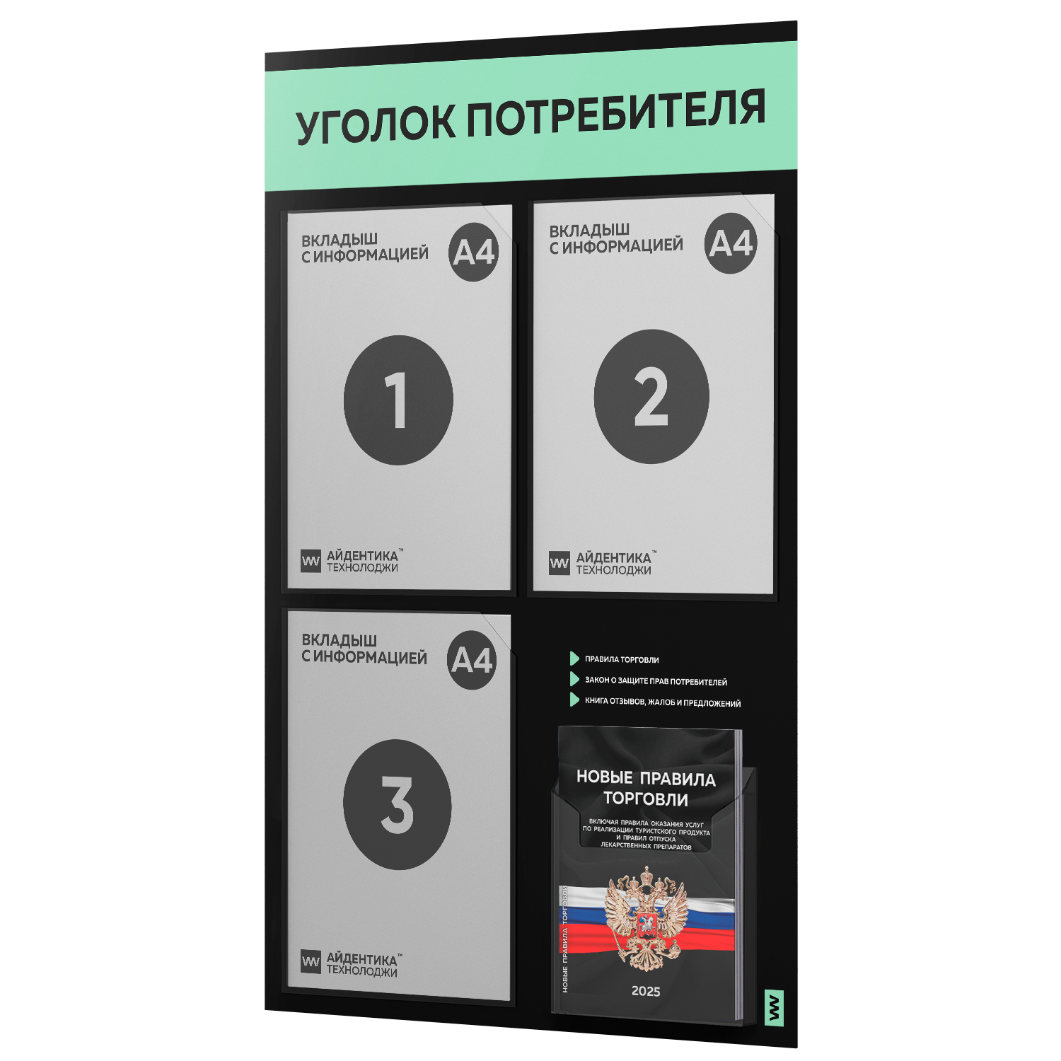 Купить Уголок потребителя 2025 + черный комплект книг 2025, черный стенд с мятным, 4 кармана, 2х2, серия Black Color, Айдентика Технолоджи с доставкой по всей России.