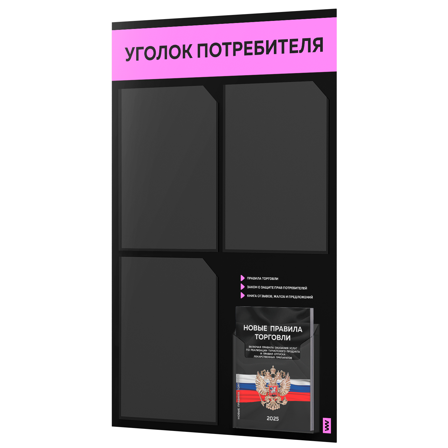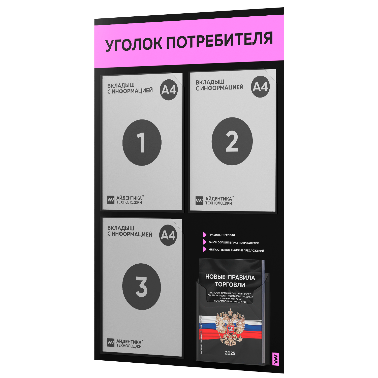 Купить Уголок потребителя 2025 + черный комплект книг 2025, черный стенд с розовым, 4 кармана, 2х2, серия Black Color, Айдентика Технолоджи с доставкой по всей России.