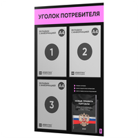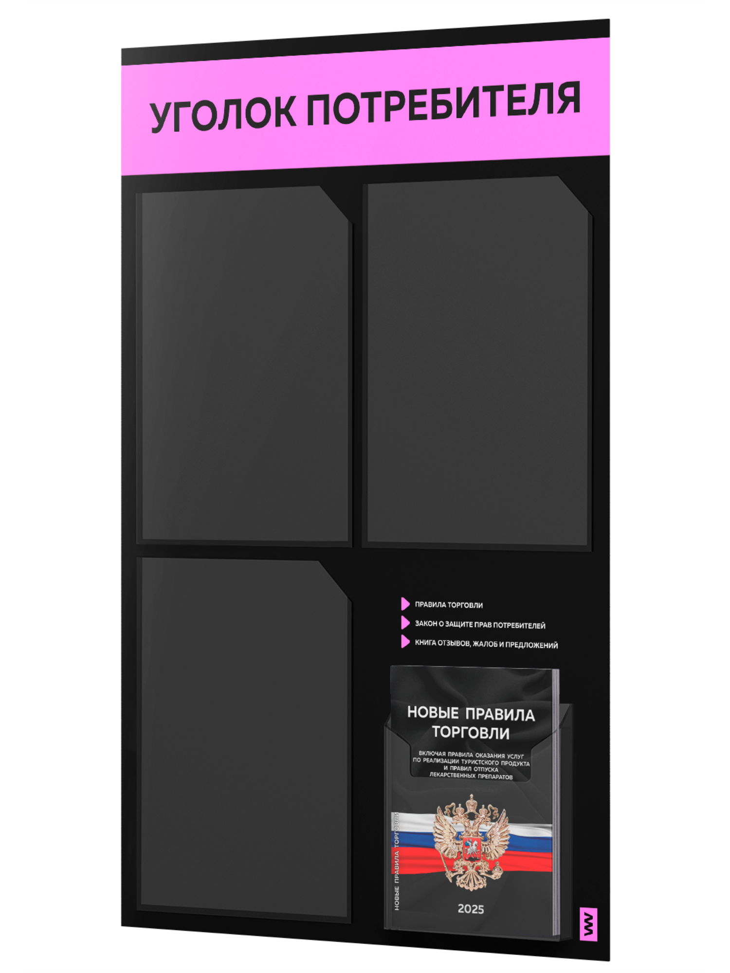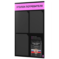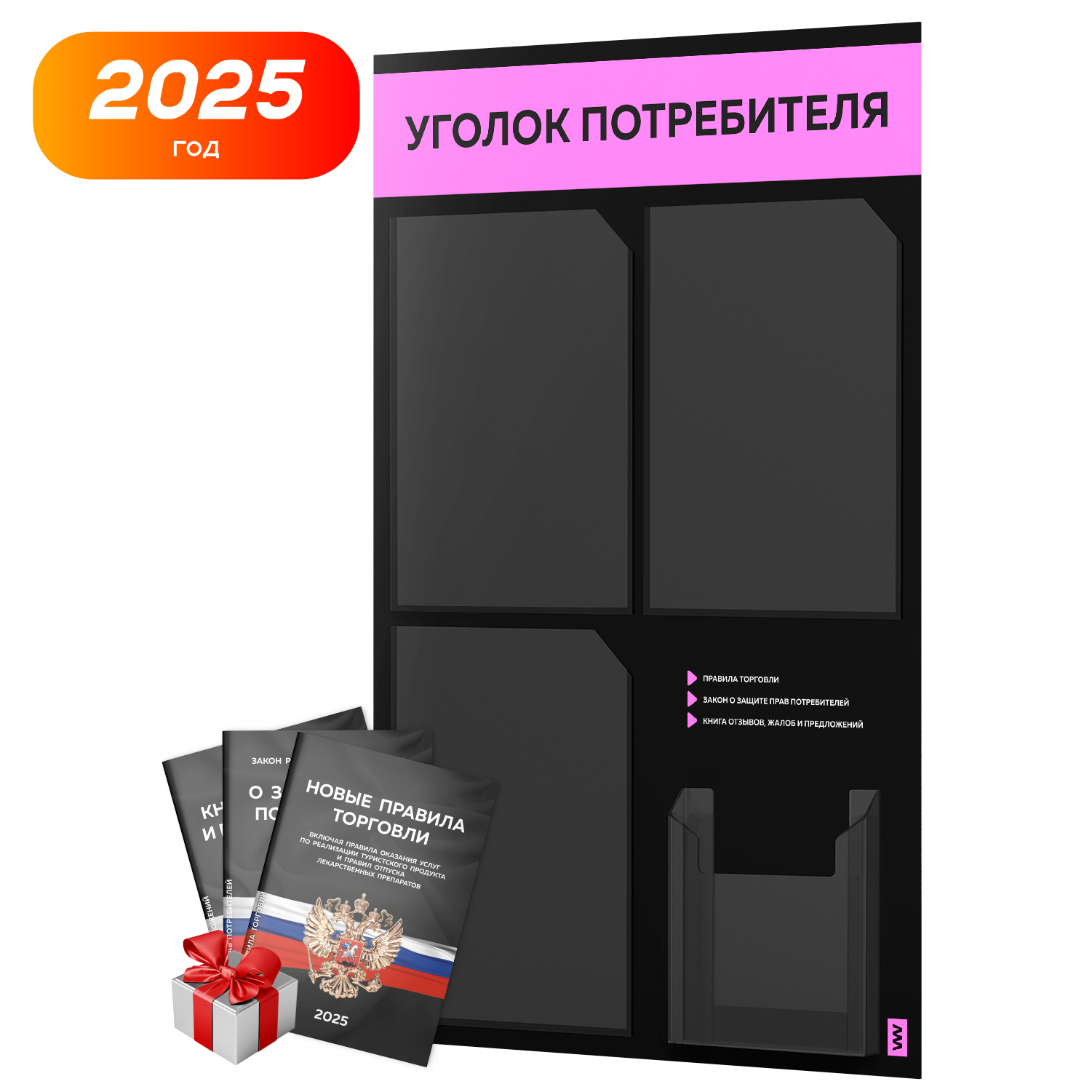Уголок потребителя 2025 + черный комплект книг 2025, черный стенд с розовым, 4 кармана, 2х2, серия Black Color, Айдентика Технолоджи: сравнение цен, характеристики, фото, актуальное наличие и цены.