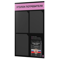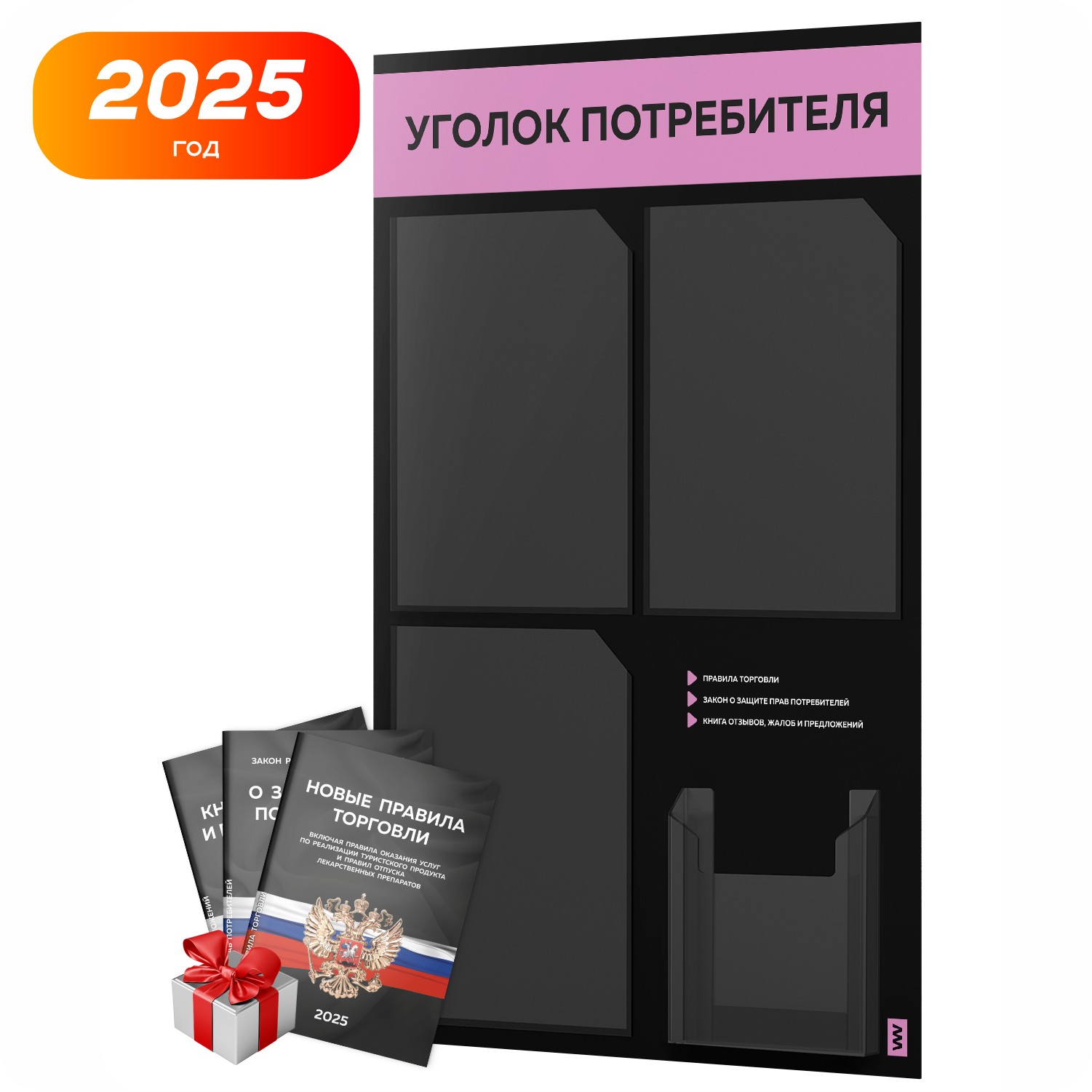 Уголок потребителя 2025 + черный комплект книг 2025, черный стенд с сиреневым, 4 кармана, 2х2, серия Black Color, Айдентика Технолоджи: сравнение цен, характеристики, фото, актуальное наличие и цены.