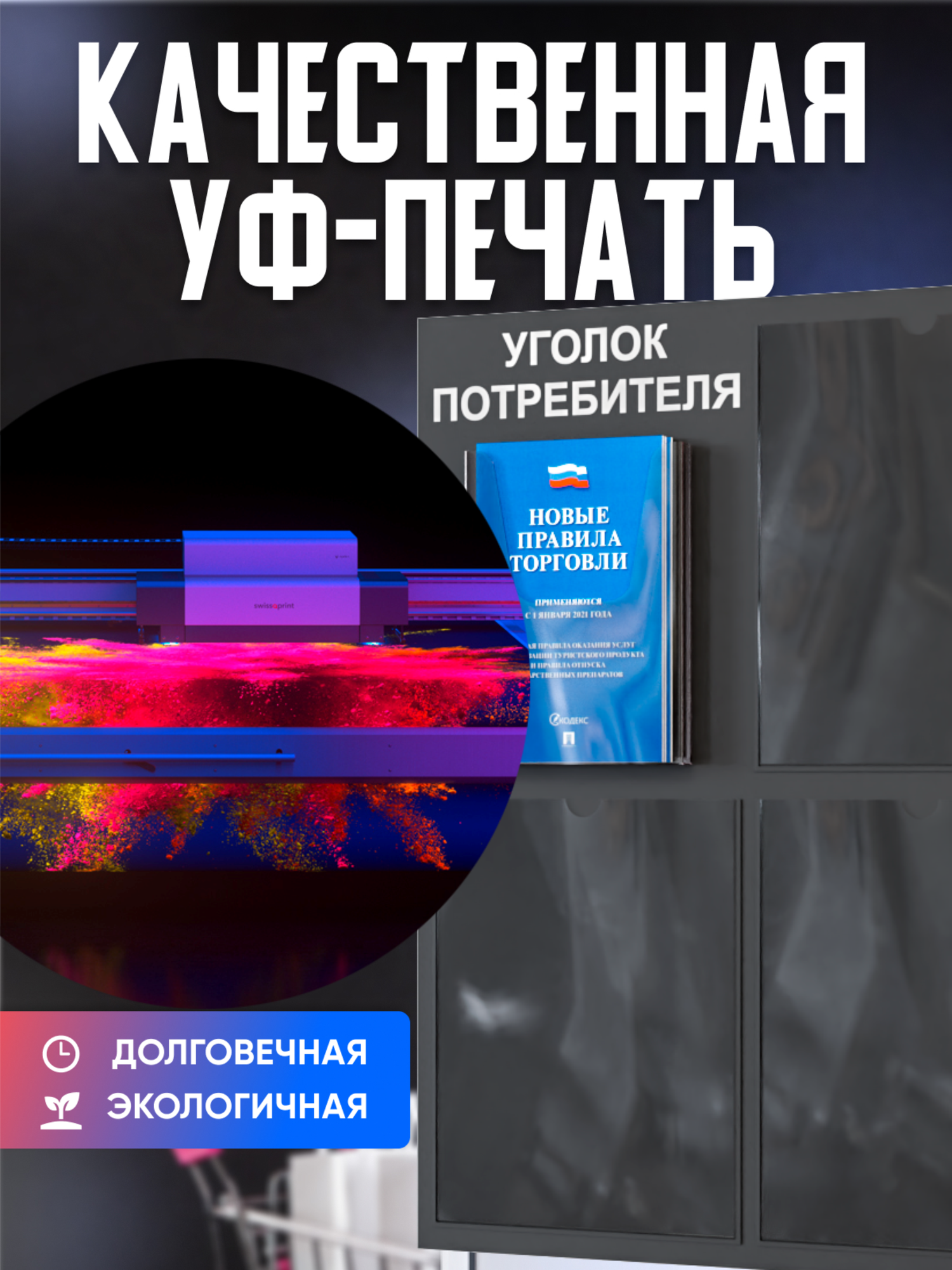 Стенд изготовлен из качественного пластика ПВХ толщиной 3 мм, что обеспечивает его устойчивость к влаге и выгоранию. Благодаря этому, уголок потребителя будет служить вам долгое время, сохраняя свой первоначальный вид.