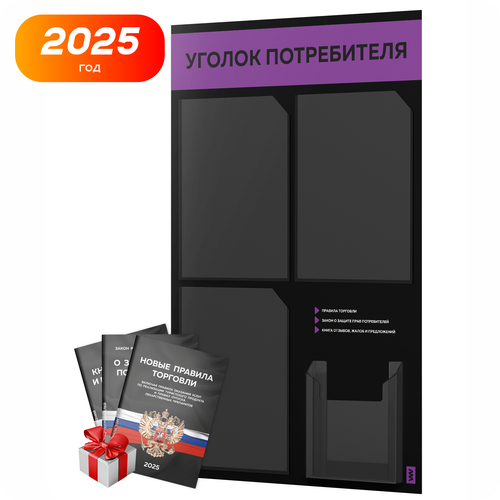 Купить Уголок потребителя 2025 + комплект книг 2025 г, черный информационный стенд с фиолетовым, 4 кармана, серия Black Color, Айдентика Технолоджи с доставкой по всей России.