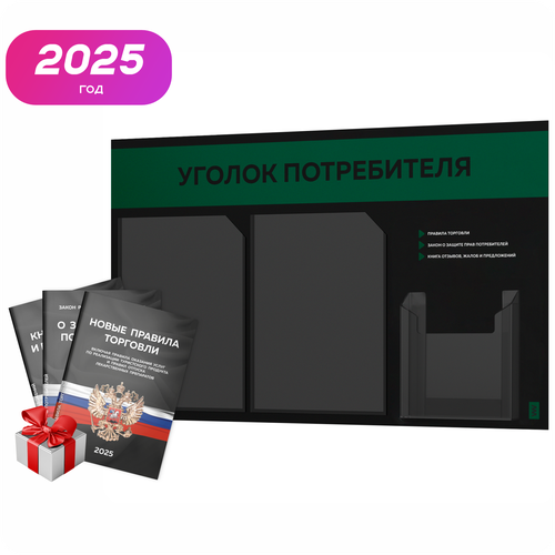 Уголок потребителя 2025 + комплект книг 2025 г, черный информационный стенд с темно-зеленым, 3 кармана, серия Black Color, Айдентика Технолоджи: сравнение цен, характеристики, фото, актуальное наличие и цены.
