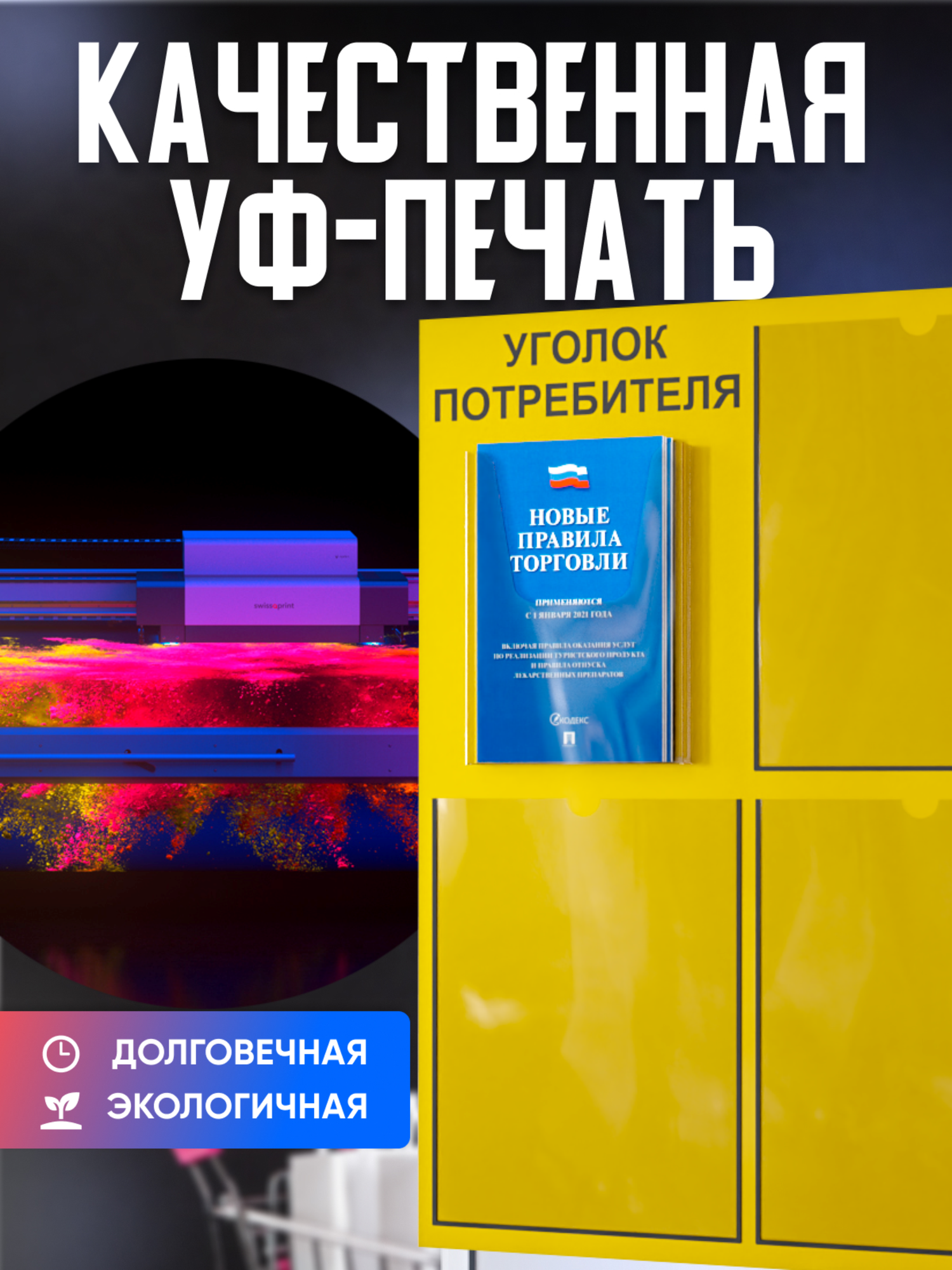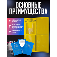 Стенд изготовлен из качественного пластика ПВХ толщиной 3 мм, что обеспечивает его устойчивость к влаге и выгоранию. Благодаря этому, уголок потребителя будет служить вам долгое время, сохраняя свой первоначальный вид.