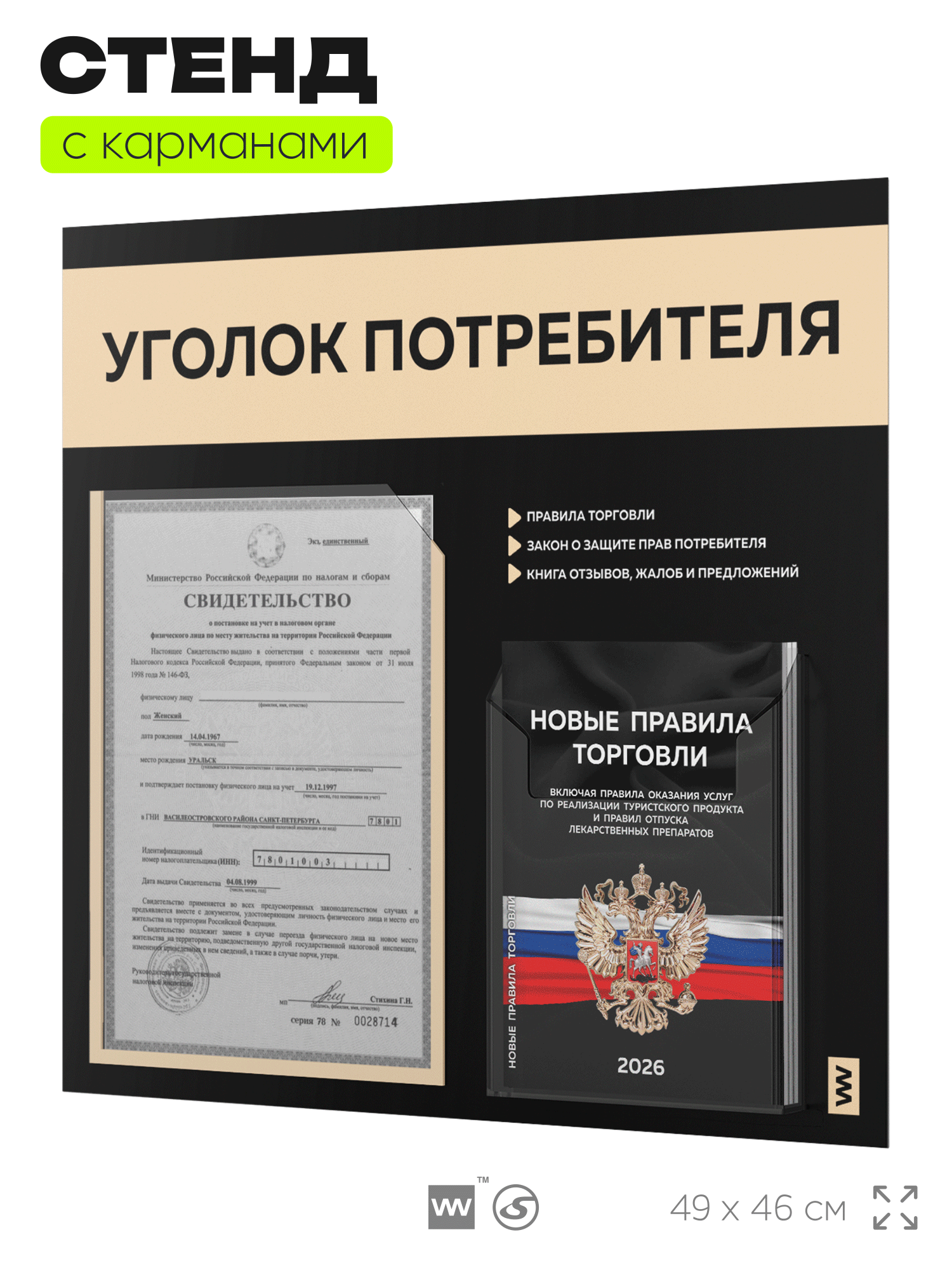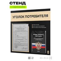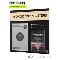 Стильный, современный и удобный информационный стенд Уголок потребителя от Айдентика Технолоджи. Настенный стенд Уголок Потребителя 2026 пришел на замену версии 2025, 2024 и 2023 года, стенд укомплектован самым новым и актуальным законодательством 2026 года, набор книг включает в себя все актуальные правки в законодательство. Стенд выполнен из качественного пластика с цветным оформлением элементов на ваш выбор, оснащен полным комплектом необходимых книг и нормативно-правовых актов. Большой выбор цветов и моделей стенда. Подойдет для любого интерьера магазина, кафе, фитнес-клуба, аптеки, салона красоты, автомойки, ногтевой и бьюти-студии, шиномонтажа, дома быта, магазина цветов и других точек продаж. Уголок потребителя подойдет для любой формы организации, как ИП так и ООО. Уголок покупателя Айдентика Технолоджи полностью отвечает требованиям Роспотребнадзора по защите прав потребителей. На стенде Уголок покупателя расположены: - 1 плоский карман для листа формата А4 (297х210мм). - 1 объемный карман для документов формата А5 (210х148мм). В объемном кармане располагаются: - Книга отзывов, жалоб и предложений: 1 шт. - Книга Правила торговли: 1 шт. - Закон о защите прав потребителей: 1 шт. Размеры стенда: 460 х 490 мм. (В х Ш) Материал конструкции: пластик 3 мм. Материал карманов: ПЭТ прозрачный и акриловое стекло. Сзади стенда нанесен крепкий профессиональный скотч для установки уголка потребителя на стену. Также предусмотрен альтернативный вариант крепления информационного стенда - саморезами. Саморезы и декоративные заглушки идут в комплекте с уголком потребителя. Ознакомьтесь также с другим торговым оборудованием и информационными указателями Айдентика Технолоджи.