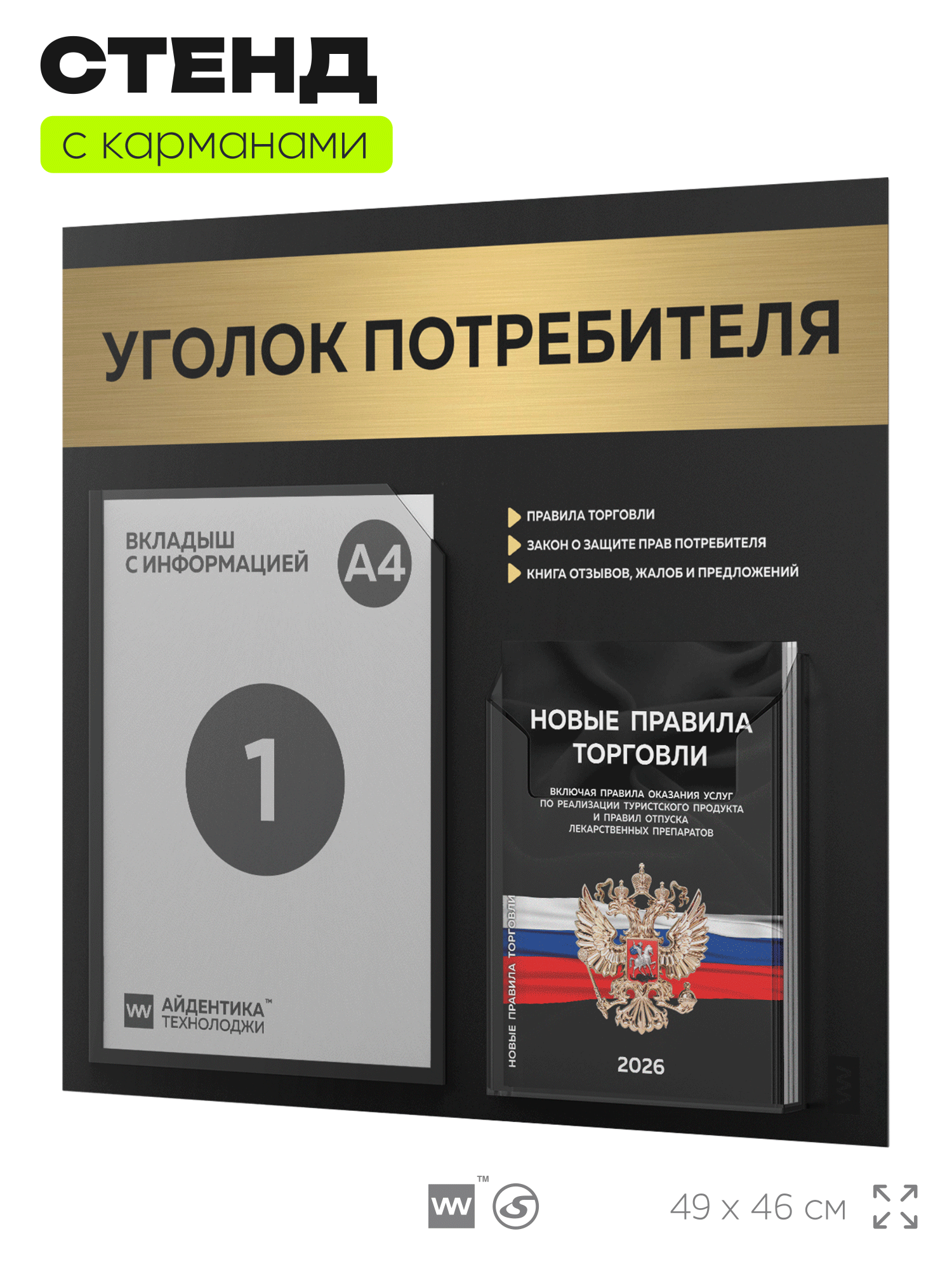 Уголок потребителя 2026 c книгами, информационный стенд покупателя черный с золотом, Айдентика Технолоджи: сравнение цен, характеристики, фото, актуальное наличие и цены.