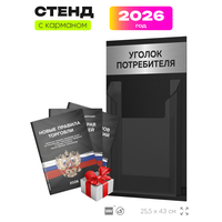 Стенд "УГОЛОК ПОТРЕБИТЕЛЯ": 1 шт.; Книга отзывов, жалоб и предложений: 1 шт.; Книга Правила торговли: 1 шт.; Закон о защите прав потребителей: 1 шт.; Крепежный набор