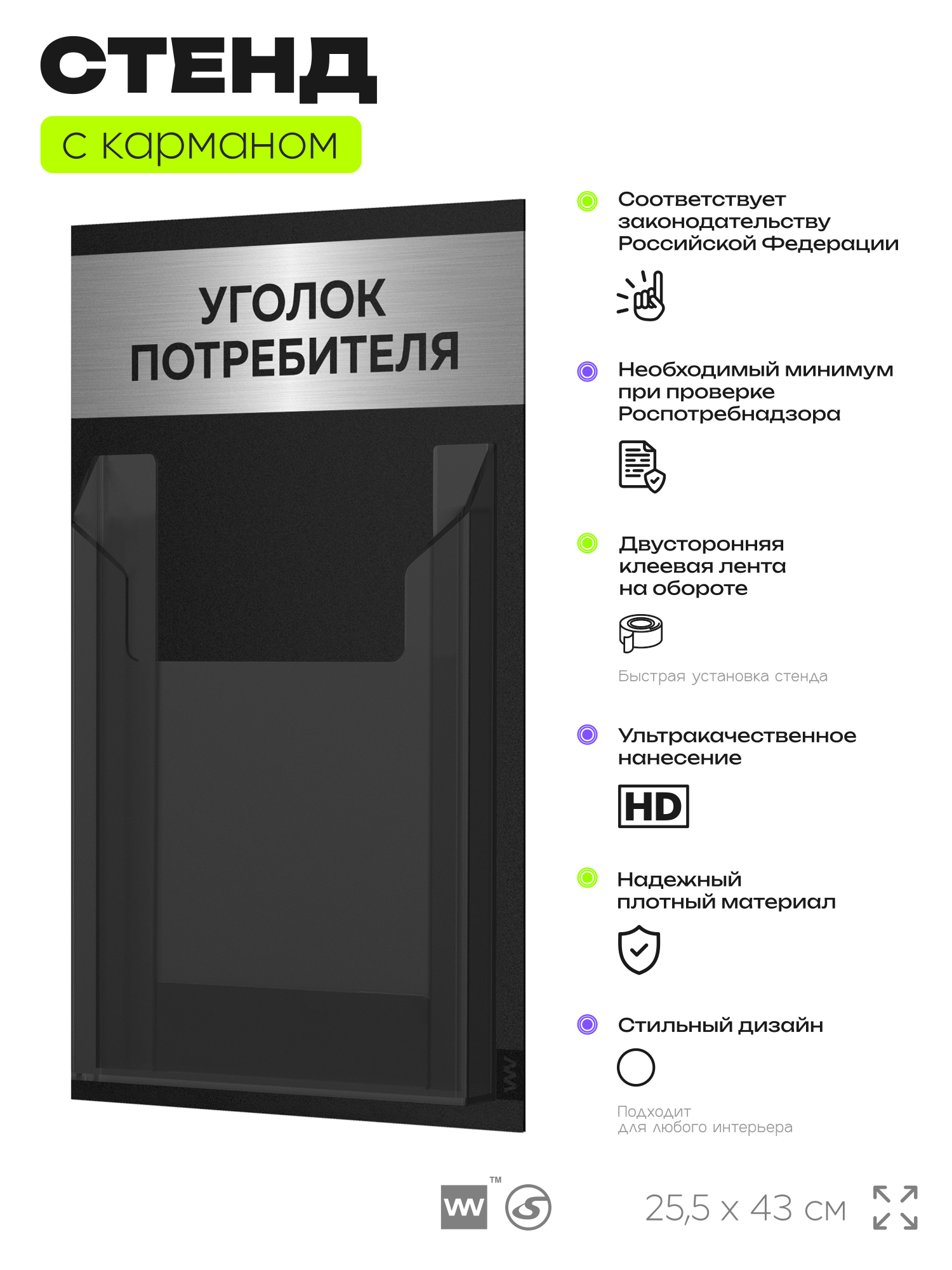 Черный уголок потребителя Мини на 1 карман и брашированным хромированным металликом, это отличное решение для небольшого магазина, выездной торговли и ярмарки, где нет места для стационарного уголка потребителя. Этот стенд полностью отвечает требованиям Роспотребнадзора, вся необходимая информация для покупателя размещается в одном кармане. Стенд уже укомплектован набором необходимых книг свежего и актуального издания этого года. Айдентика Технолоджи это проверенный российский бренд выпускающий качественное торговое оборудование по доступной цене. Отличительной чертой продукции этого бренда является высокое внимание к деталям, все стенды укомплектованы крепежом и другими вспомогательными атрибутами. Также визитной карточкой бренда является большой ассортимент цветов продукции. Уголок потребителя подойдет для ИП и ООО, небольшого магазина, салона красоты, шиномонтажа, сервисного центра и других организаций. Айдентика Ритейл является официальным дилером компании, это позволяет гарантировать выгодную цену для покупателей.