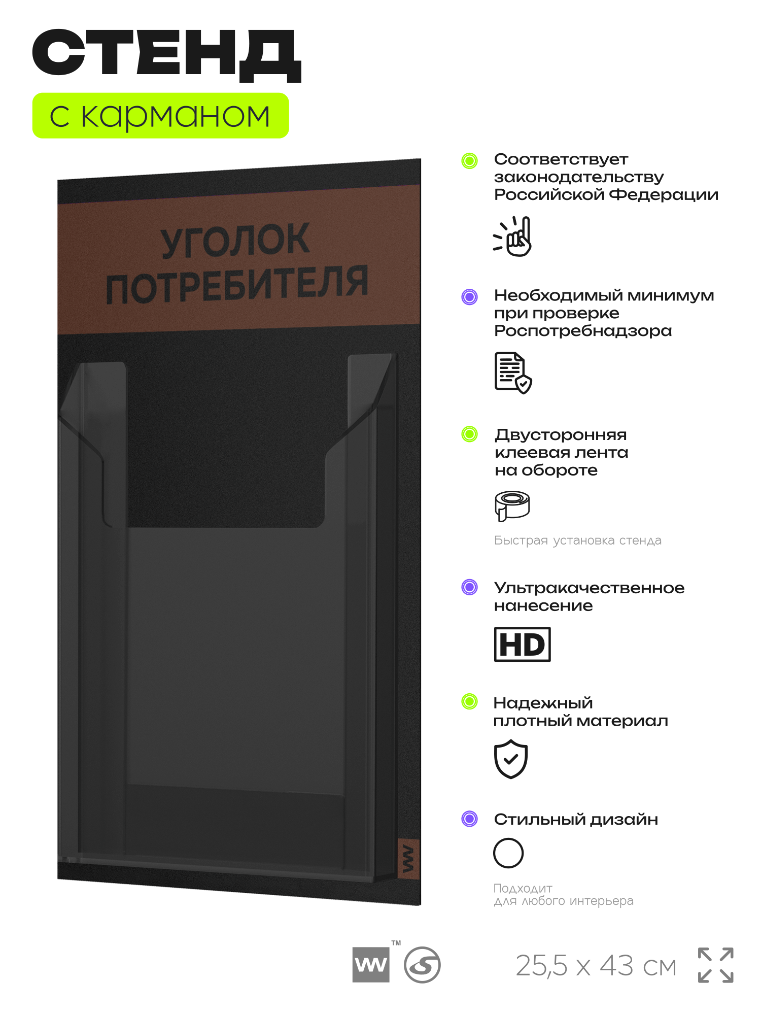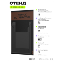 Черный уголок потребителя Мини на 1 карман и коричневым оформлением, это отличное решение для небольшого магазина, выездной торговли и ярмарки, где нет места для стационарного уголка потребителя. Этот стенд полностью отвечает требованиям Роспотребнадзора, вся необходимая информация для покупателя размещается в одном кармане. Стенд уже укомплектован набором необходимых книг свежего и актуального издания этого года. Айдентика Технолоджи это проверенный российский бренд выпускающий качественное торговое оборудование по доступной цене. Отличительной чертой продукции этого бренда является высокое внимание к деталям, все стенды укомплектованы крепежом и другими вспомогательными атрибутами. Также визитной карточкой бренда является большой ассортимент цветов продукции. Уголок потребителя подойдет для ИП и ООО, небольшого магазина, салона красоты, шиномонтажа, сервисного центра и других организаций. Айдентика Ритейл является официальным дилером компании, это позволяет гарантировать выгодную цену для покупателей.