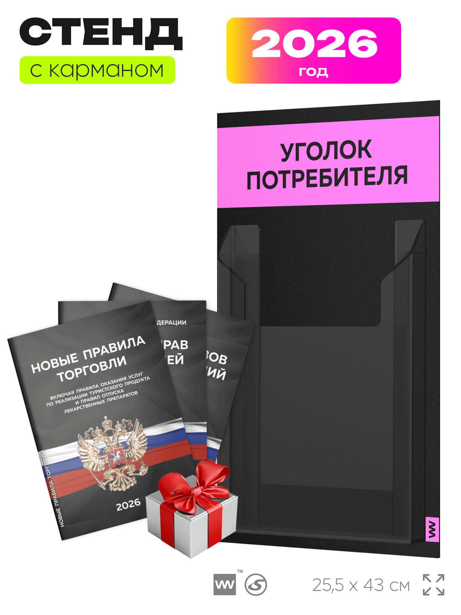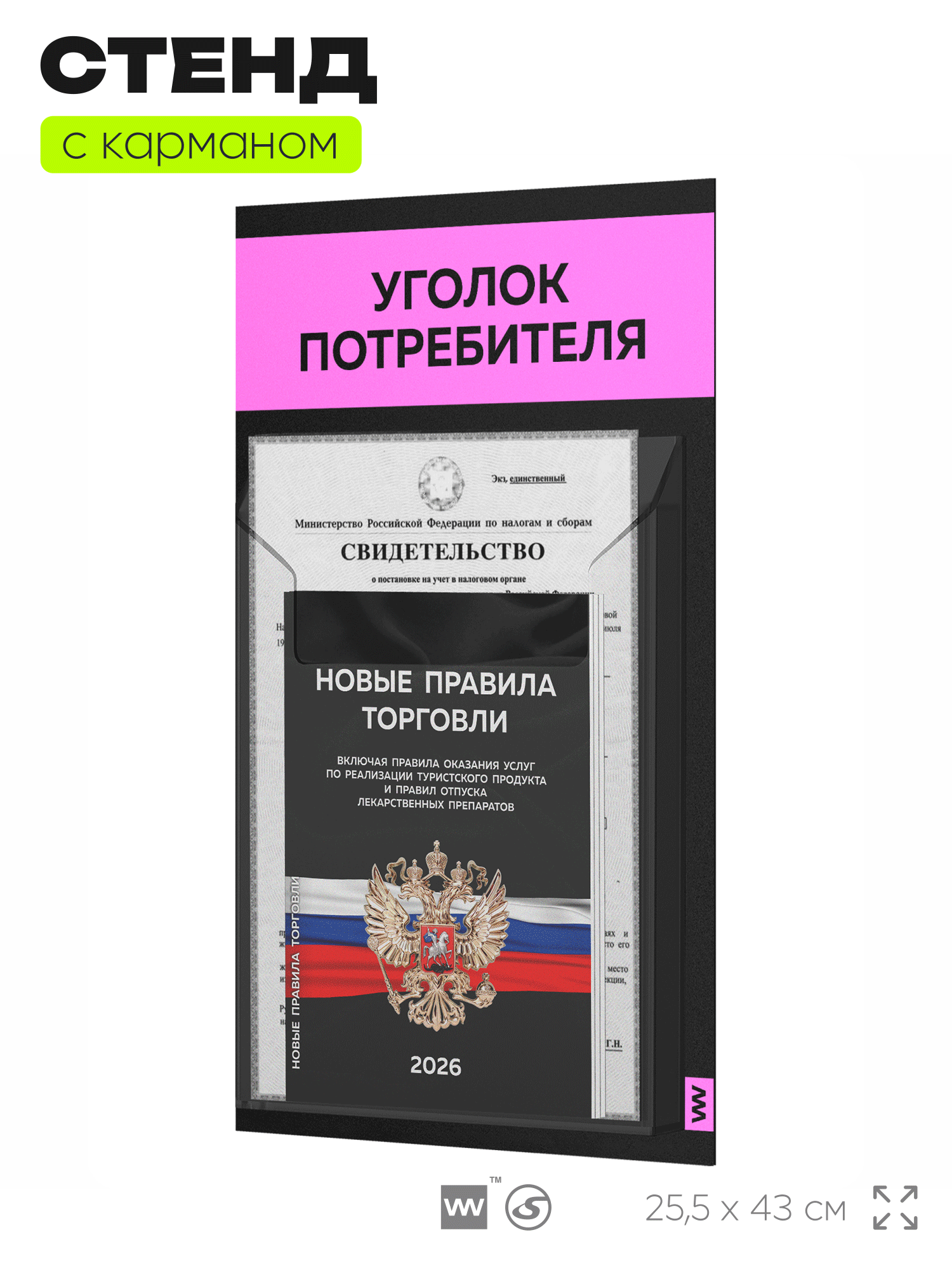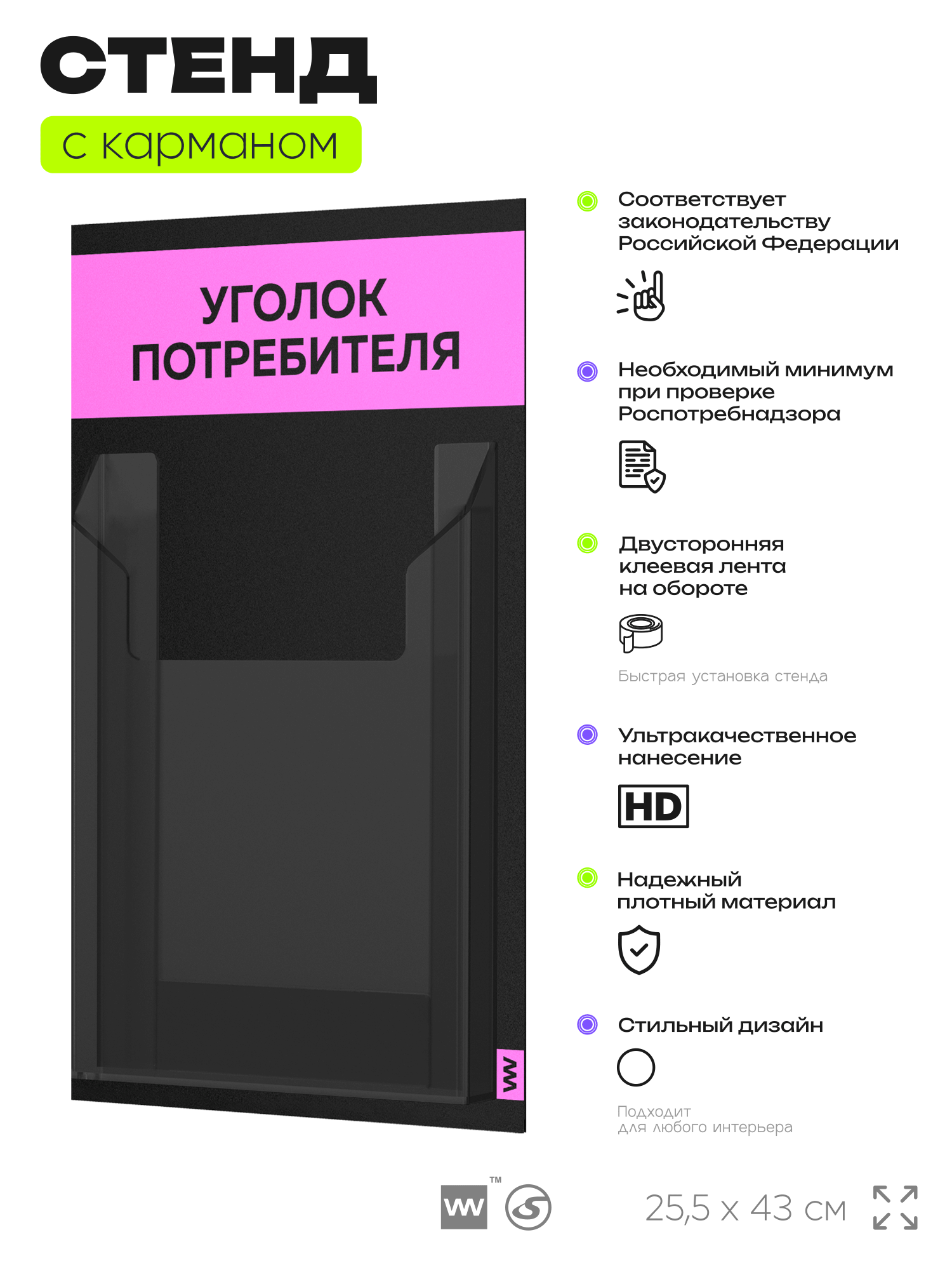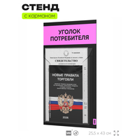 Черный уголок потребителя Мини на 1 карман и розовым оформлением, это отличное решение для небольшого магазина, выездной торговли и ярмарки, где нет места для стационарного уголка потребителя. Этот стенд полностью отвечает требованиям Роспотребнадзора, вся необходимая информация для покупателя размещается в одном кармане. Стенд уже укомплектован набором необходимых книг свежего и актуального издания этого года. Айдентика Технолоджи это проверенный российский бренд выпускающий качественное торговое оборудование по доступной цене. Отличительной чертой продукции этого бренда является высокое внимание к деталям, все стенды укомплектованы крепежом и другими вспомогательными атрибутами. Также визитной карточкой бренда является большой ассортимент цветов продукции. Уголок потребителя подойдет для ИП и ООО, небольшого магазина, салона красоты, шиномонтажа, сервисного центра и других организаций. Айдентика Ритейл является официальным дилером компании, это позволяет гарантировать выгодную цену для покупателей.
