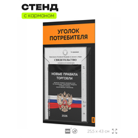 Стенд "УГОЛОК ПОТРЕБИТЕЛЯ": 1 шт.; Книга отзывов, жалоб и предложений: 1 шт.; Книга Правила торговли: 1 шт.; Закон о защите прав потребителей: 1 шт.; Крепежный набор