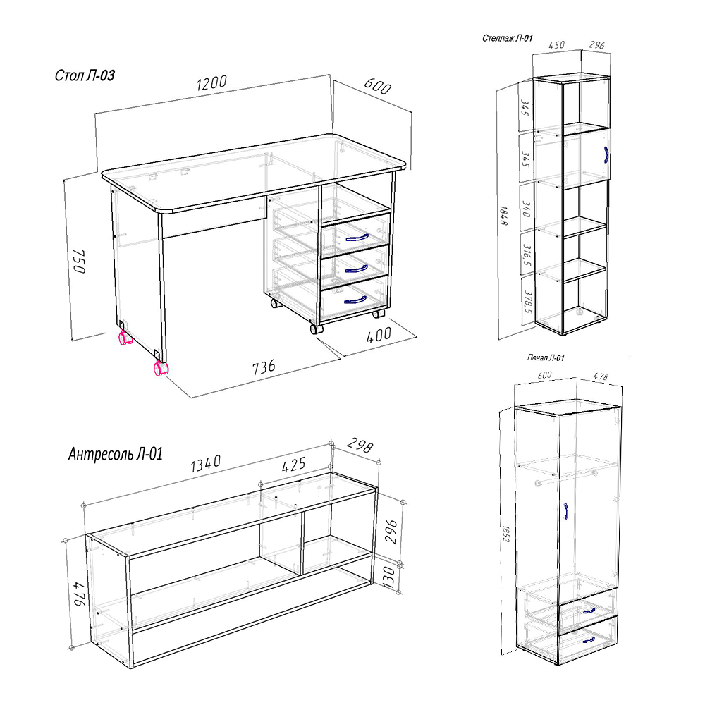 Стол Л-03 - Комфортный письменный стол Л-03 оборудован поворотными колесами, легко перемещается по полу, задвигается и выдвигается. Три выкатных ящика стола обеспечат удобное хранение канцелярии, письменных, учебных и прочих принадлежностей. Над ящиками открытая полка для мелочей, которые будут всегда под рукой.
