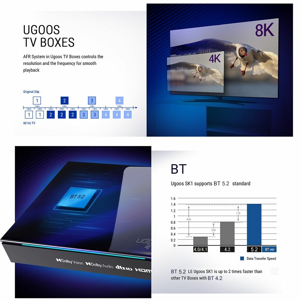 Ugoos Медиаплеер 2024 новейшая ТВ-приставка UGOOS SK1 Amlogic S928X-K, Android 11, WiFi6/BT5.2, поддержка 1000M AV1 H.265 8K 60 кадров в секунду VP9 HDR медиаплеер: сравнение цен, характеристики, фото, актуальное наличие и цены.
