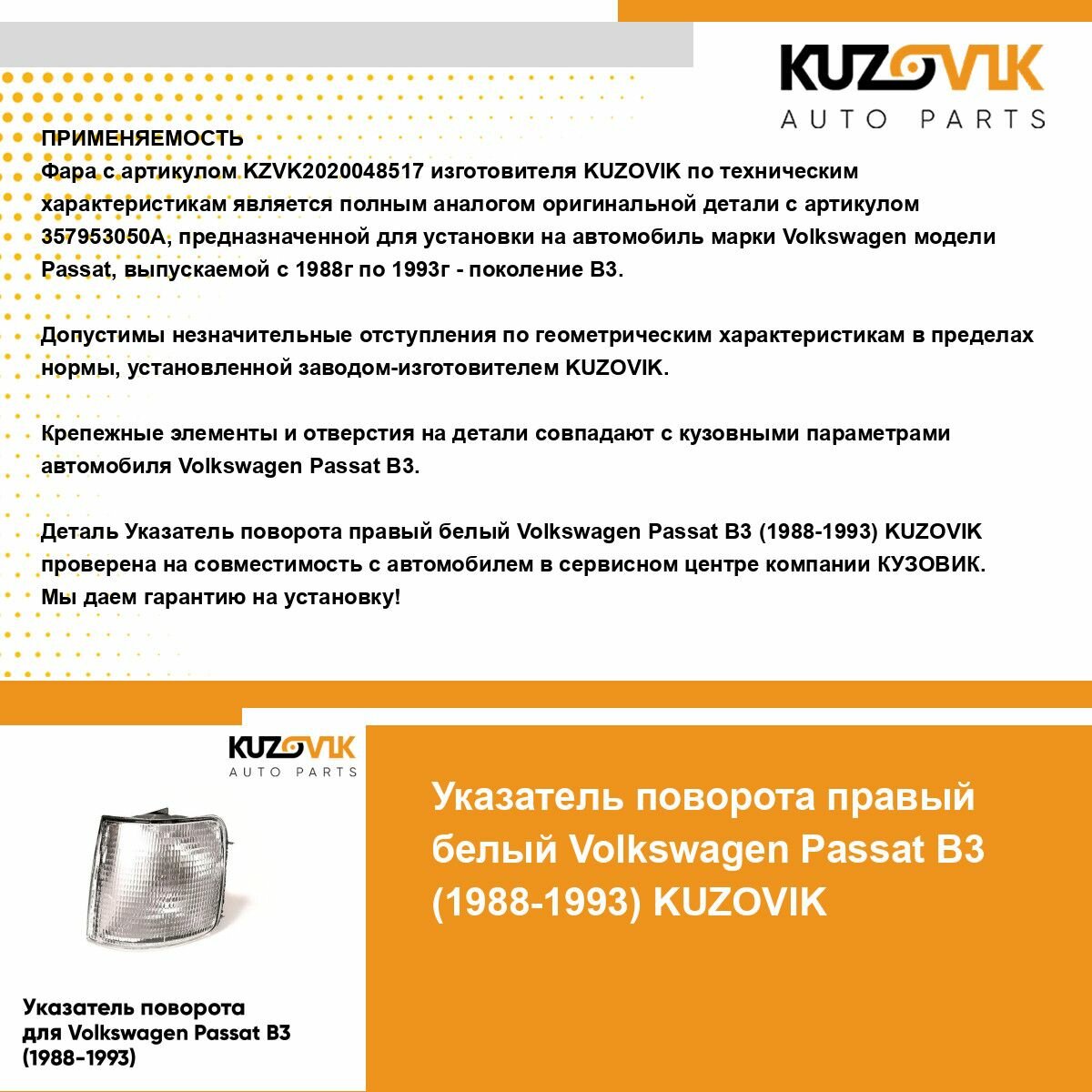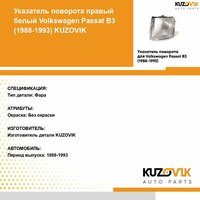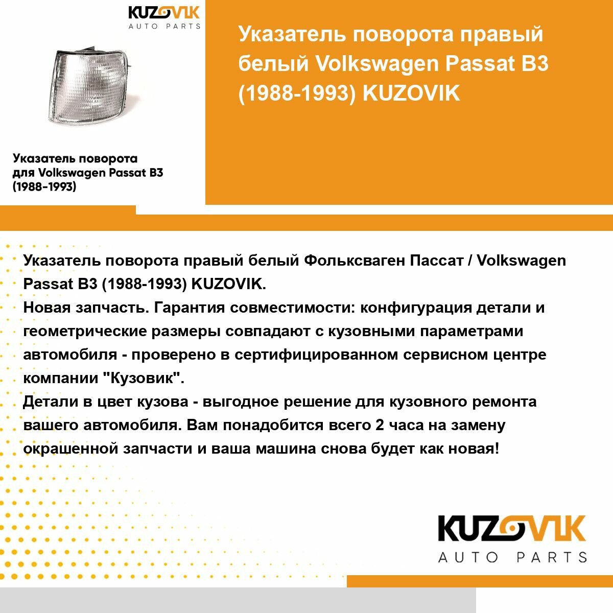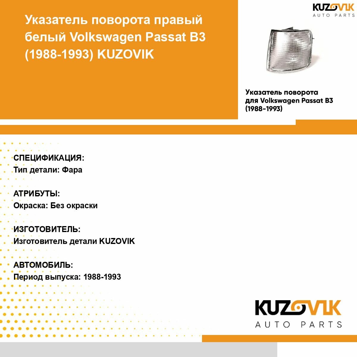 Купить Указатель поворота правый белый Volkswagen Passat B3 (1988-1993) с доставкой по всей России. Указатель поворота правый белый Volkswagen Passat B3 (1988-1993): сравнение цен, характеристики, фото, актуальное наличие и цены.
