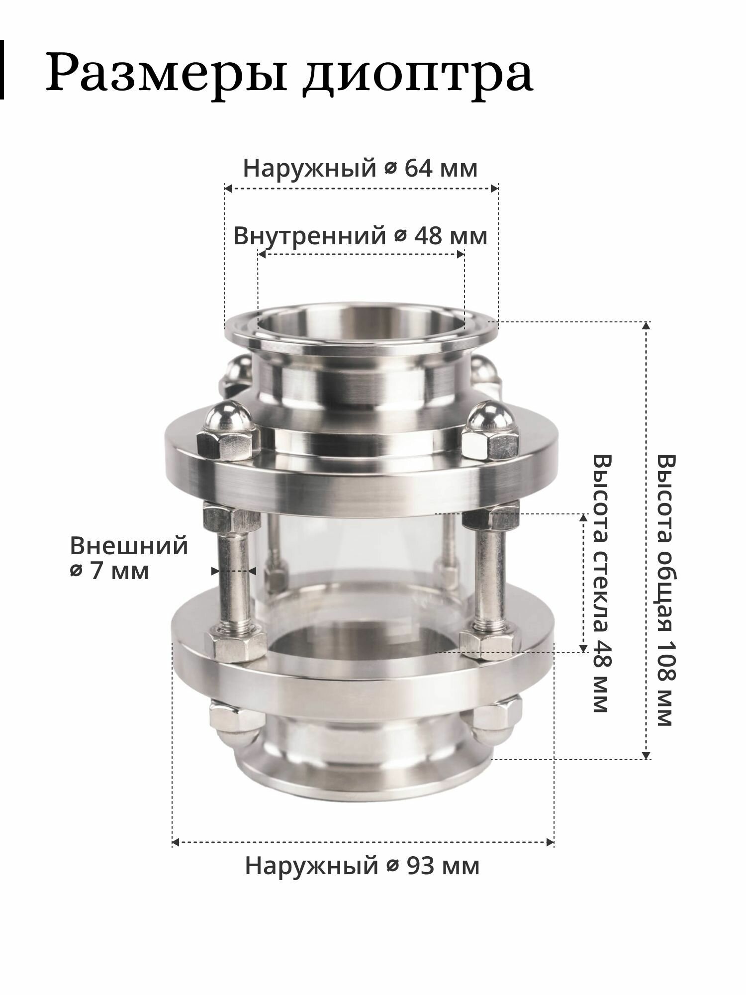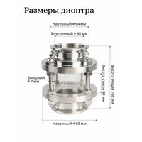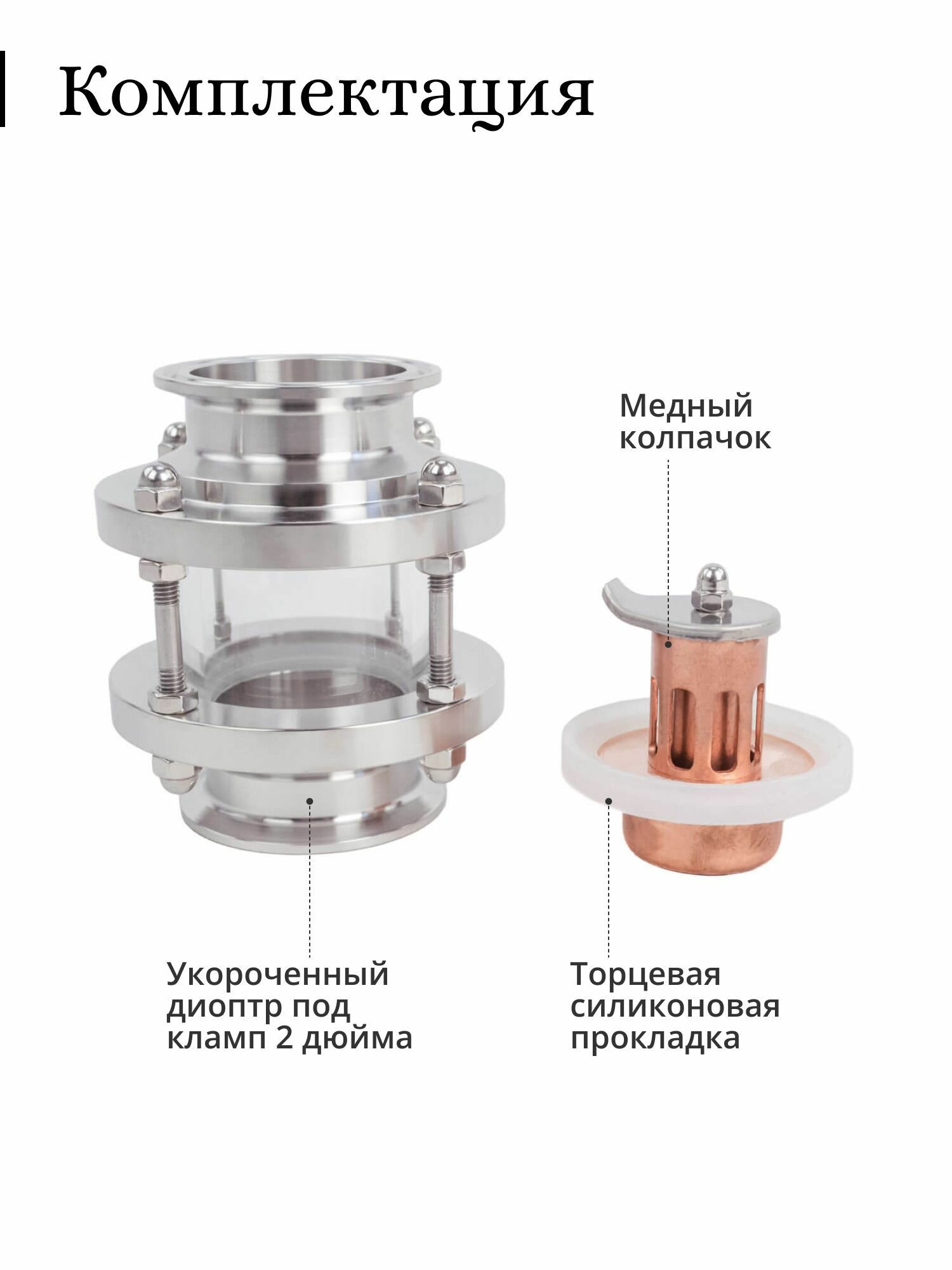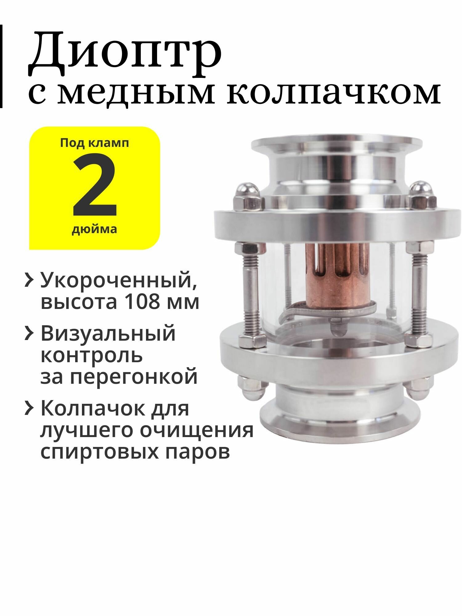 Диоптр высотой 108 мм под колонну диаметром 2 дюйма. Служит для визуального контроля за процессом перегонки. Что позволяет предотвратить захлебывание колонны, пено- и брызгоунос. Использование диоптра дает возможность оценить происходящие внутри колонны процессы.