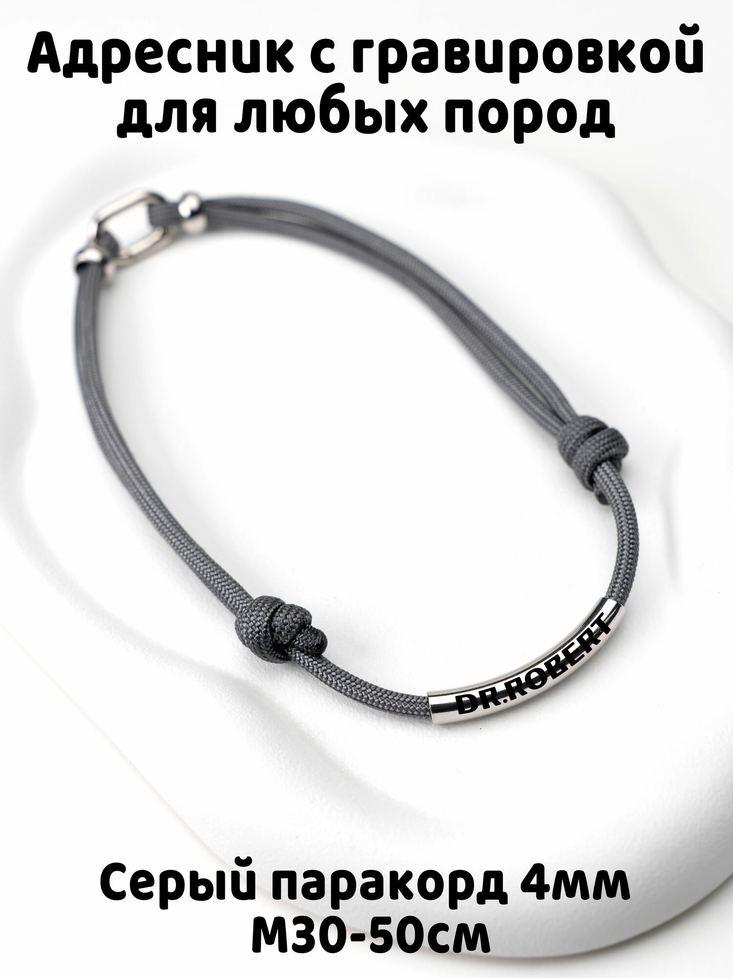 - Гравировка на украшении позволяет легко идентифицировать вашего питомца в случае потери.- Шнур паракорд, который используется для крепления украшения, легко регулируется и не скользит.