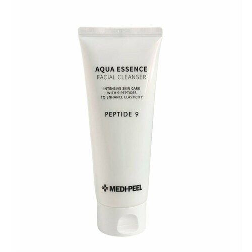Укрепляющая пенка с комплексом пептидов MEDI-PEEL Peptide 9 Aqua Essence Facial Cleanser деликатно очищает кожу от загрязнений, излишков себума и лёгкого макияжа (не очищает силиконы ВВ-кремов и тональных основ). Тянущаяся текстура пенки обусловлена добавлением в состав гидролизата коллагена. Она будто обволакивает кожу, способствуя глубокому и щадящему очищению пор.
