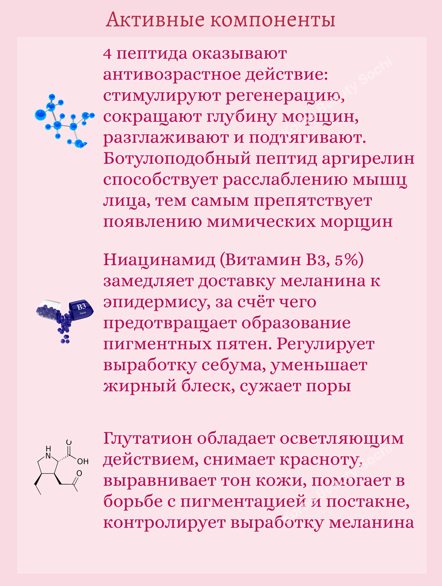 восстановление, выравнивание микрорельефа, лифтинг, омоложение, отбеливание, повышение упругости, против акне, снятие воспалений, снятие отеков, сужение пор, тонизирование, увлажнение, улучшение цвета, успокаивающий