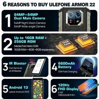 Armor 22 имеет систему из двух камер на задней панели: 64 МП широкоугольная камера и 64 МП камеры ночного видения. Производительность камеры нового уровня.