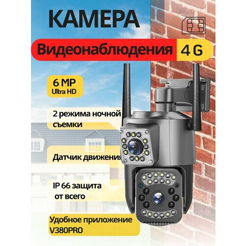 Уличная поворотная Camera 6MP, с обратной голосовой связью. Разрешение: 1920*1080 HD. Градус поворота 350 градусов по горизонтали и 180 градусов по вертикали. За счет двойной камеры не имеет слепых зон. Защищенность ip 67, что позволяет использовать ip камеру видеонаблюдения на улице в агрессивной среде. Запись сохраняется в облачном хранилище или на карте памяти объемом до 128 ГБ. Диаметр объектива 2.8. За счет LED подсветки в ночное время камера покажет цветное изображение, а за счет ИК черно-белое. Видеокамера 4G от сим карты, позволяет вести наблюдение даже в условиях слабого освещения или полной темноты. Двойная камера видео наблюдения имеет охранный режим, позволяющий самостоятельно следить за движением на объекте и отправлять Вам уведомление. Уличная камера видеонаблюдения с поддержкой уведомления, без труда спугнет нарушителя с вашего участка, дачи, квартиры, есть тревожный сигнал . Данная камера видеонаблюдения уличная имеет дальность ИК подсветки 30м. Также камера снабжена микрофоном, поэтому вы можете использовать ее в качестве домофона. В данной версии камеры улучшен 4G модуль, позволяющий камере принимать сигнал на большем расстоянии. Работает на приложении v380Pro.