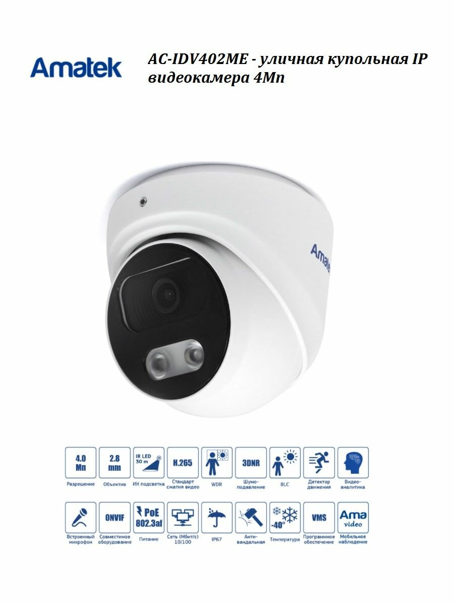 Уличная купольная IP видеокамера Amatek AC-IDV402ME 4Мп, ИК подсветка 30м.: сравнение цен, характеристики, фото, актуальное наличие и цены.