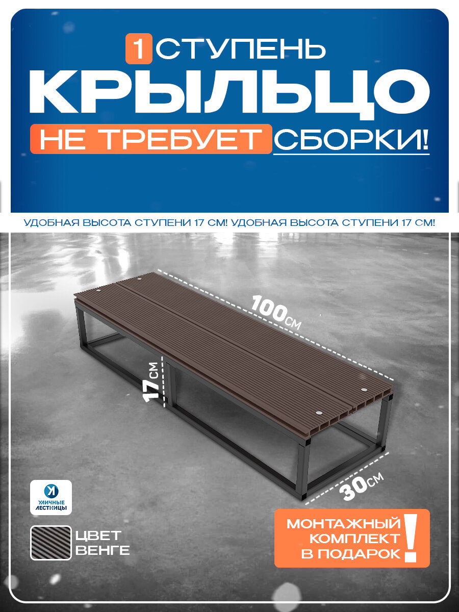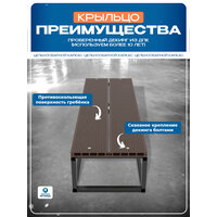 Готовое решение. Можно закрепить к фасаду или цоколю через проушины под верхней ступенью. Доски из дпк выступают по бокам на 25 мм относительно каркаса. Крепление ступеней к каркасу сквозное оцинкованными мебельными болтами. Атмосферостойкая окраска. Сварной каркас с отделкой ступеней пустотелым декингом ДПК. Цвет террасеной доски ДПК Венге. Цвет каркаса черный. На фото выше, ступень выдерживает УАЗ Патриот.