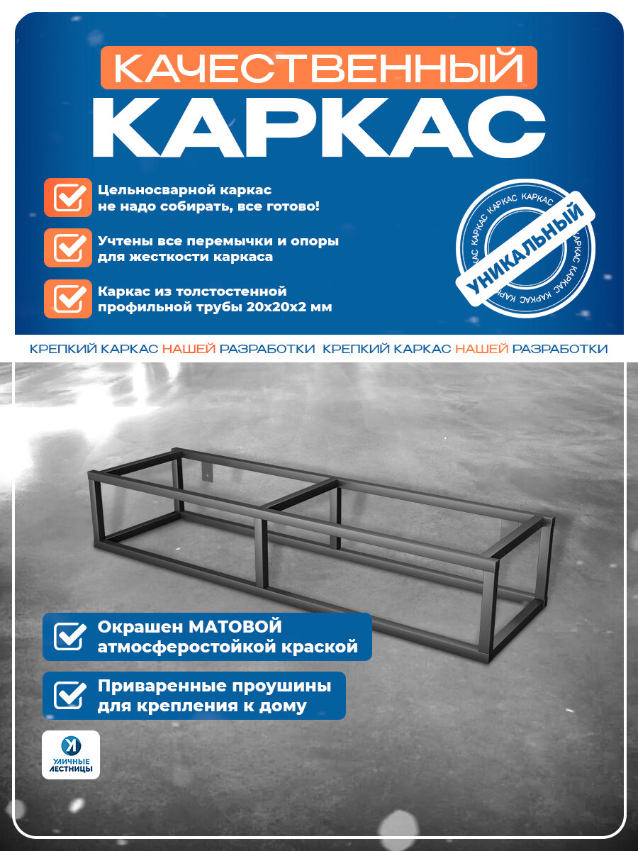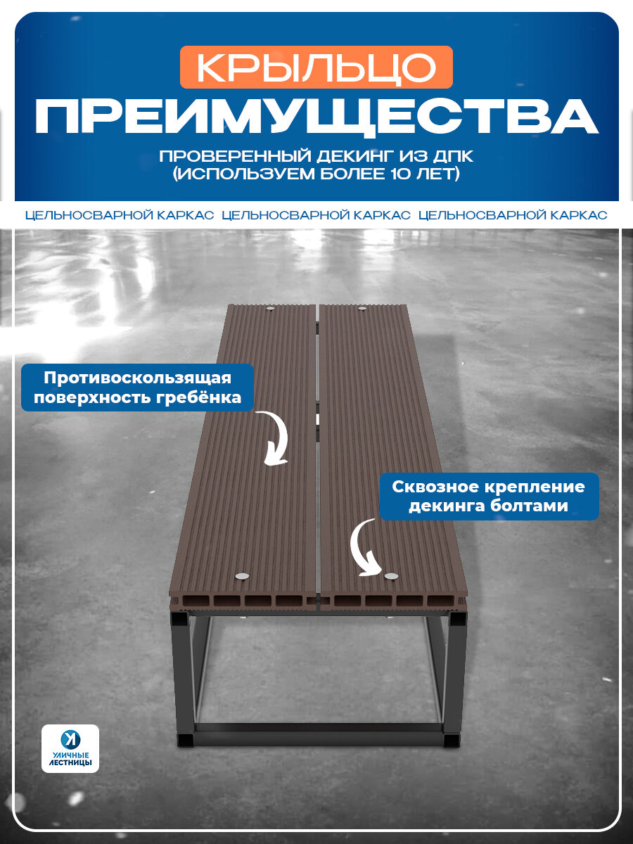 Лестница выполнена на металлическом каркасе из профиля 20х20, что обеспечивает ее прочность и долговечность. Ступени изготовлены из качественного декинга ДПК, который отличается своей устойчивостью к износу и воздействию влаги.