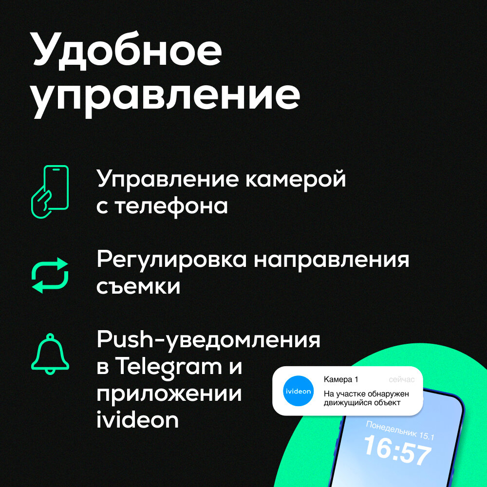 Камера может быть подключена к сети через Wi-Fi или Ethernet. Управление камерой и доступ к записям осуществляется через приложение Ivideon. Первичное подключение камеры осуществляется через сетевой кабель, после чего можно настроить беспроводное соединение.