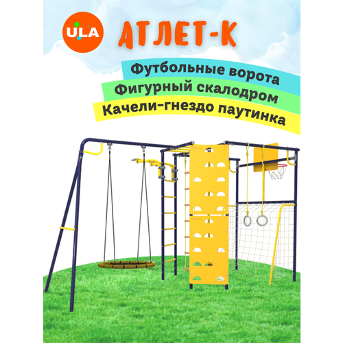 Комплектация: - шведская стенка - рукоход - турник с прямым и широким хватами - кольца гимнастические - канат - веревочная лестница - корзина баскетбольная - скалодром - ворота футбольные - рама для качелей - качели-гнездо 75 см