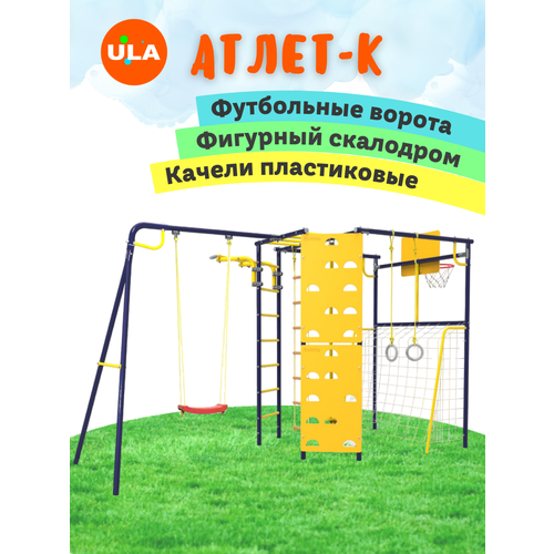Комплектация: - шведская стенка - рукоход - турник с прямым и широким хватами - кольца гимнастические - канат - веревочная лестница - корзина баскетбольная - скалодром - ворота футбольные - рама для качелей - качели пластиковые лодочка