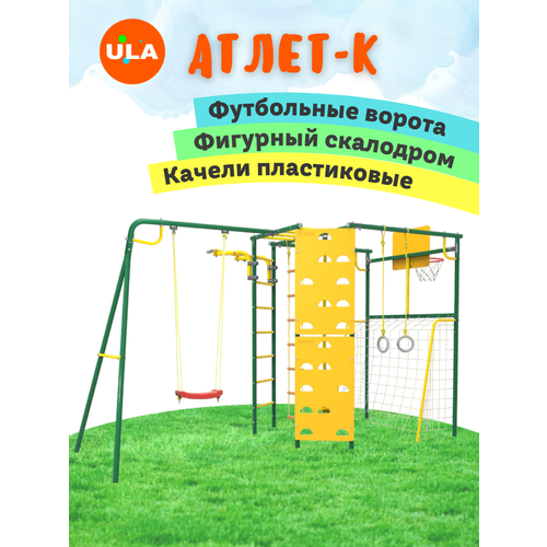 Комплектация: - шведская стенка - рукоход - турник с прямым и широким хватами - кольца гимнастические - канат - веревочная лестница - корзина баскетбольная - скалодром - ворота футбольные - рама для качелей - качели пластиковые лодочка