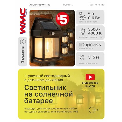 Светодиодный настенный фонарь от бренда WMC TOOLS на солнечной батарее с датчиком движения и датчиком света обеспечивает качественное освещение во дворе, гараже, на даче или природе. Комплект 5 шт.