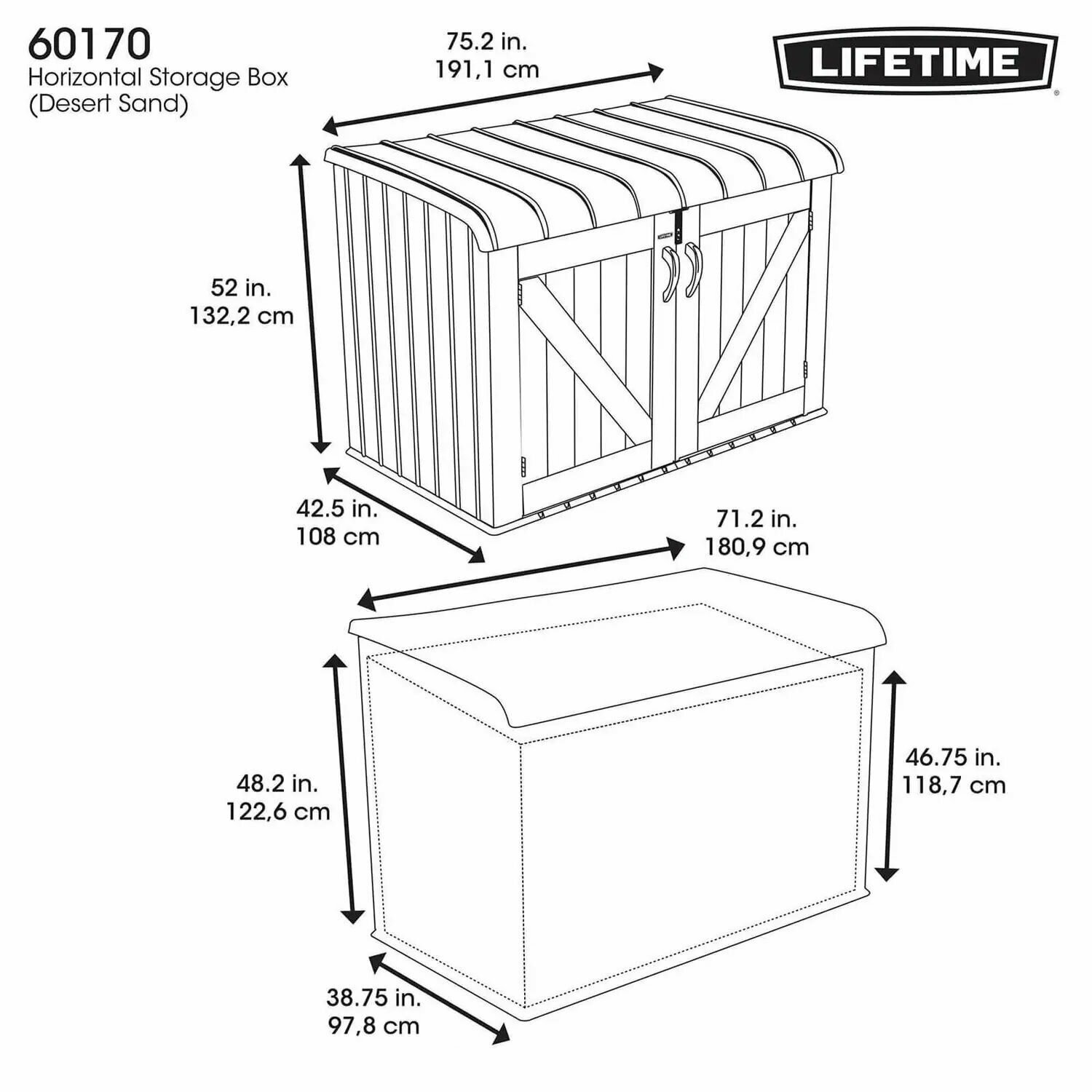 Храните свои вещи на улице в горизонтальном шкафу для хранения Lifetime. Жесткая конструкция из полиэтилена высокой плотности (HDPE) с двойными стенками делает шкаф прочным, долговечным и надежным. Его конструкция с защитой от ультрафиолетового излучения и устойчивая к погодным условиям конструкция помогают сохранить ваши ценности в безопасности.