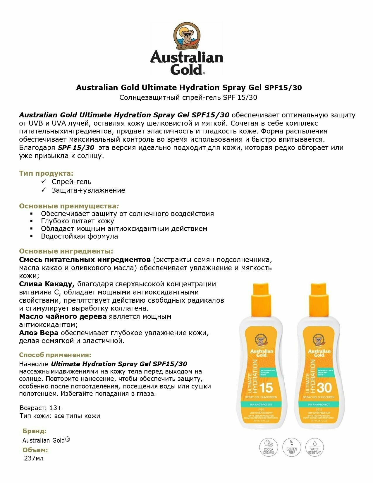 Купить Ultimate Hydration Australian Gold — спрей-гель SPF 15 для увлажнения кожи с доставкой по всей России.