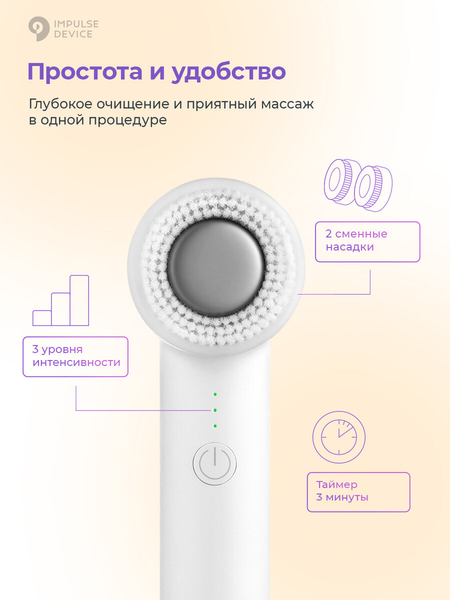С Impulse Clean можно использовать любую привычную для вас умывалку: гель, энзимную пудру, пенку. Нанесите средство на насадку или лицо и выберите нужный режим. Если вы впервые используете девайс, то лучше начать с 1 уровня интенсивности.