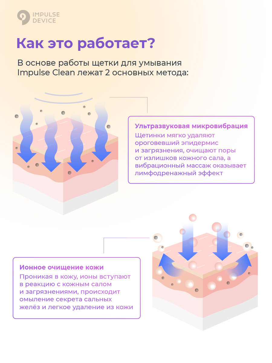 Щетка для очищения лица Impulse Clean – это современный девайс для домашнего ухода за кожей. Глубоко очищает поры от излишков кожного сала, выравнивает тон, мягко отшелушивает ороговевшие клетки эпидермиса и оказывает лимфодренажный эффект.