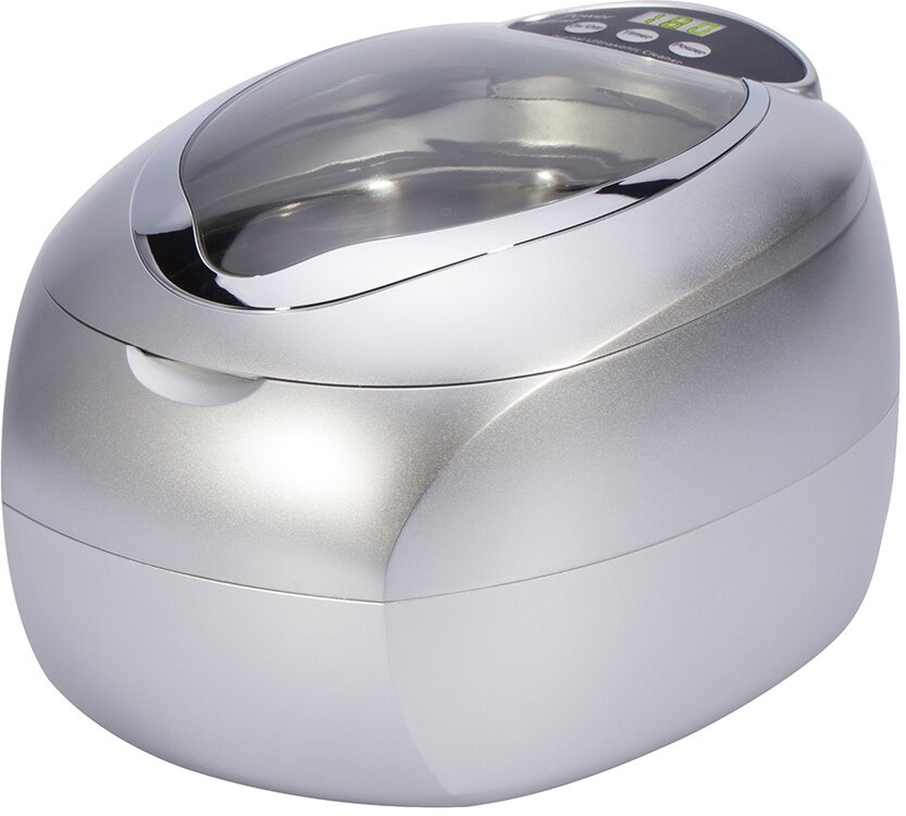 обычной водопроводной воды, частота ультразвука 42kHz, интенсивность очистки регулируется, пять установок таймера, емкость из нержавеющей стали 600мл