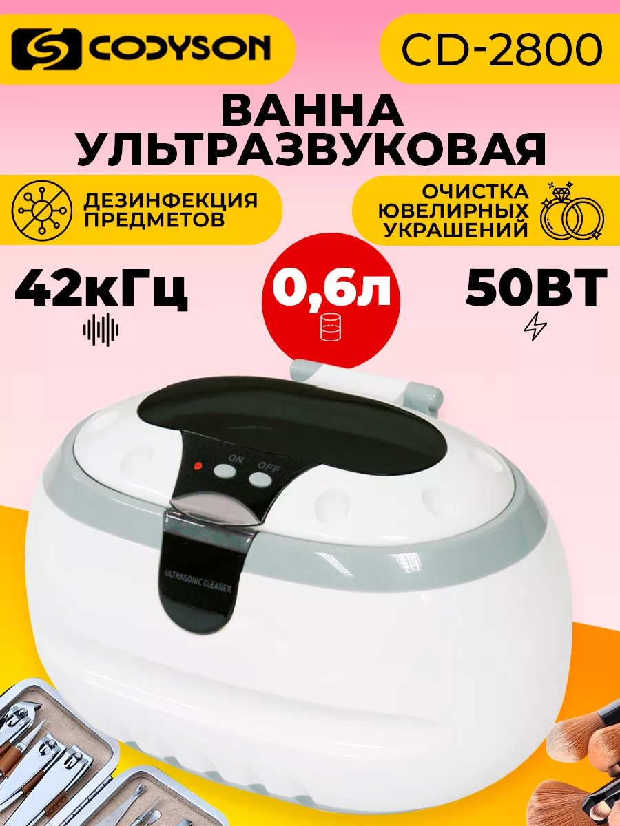 Ванна ультразвуковая CODYSON - надежный и профессиональный инструмент для ультразвуковой мойки и чистки, предотвращает повреждение деликатных изделий. Предназначена для очистки предметов из металлов и пластмасс, включая маникюрные, медицинские и стоматологические инструменты, ювелирные украшения, столовые приборы, очки, протезы, монеты, подшибники. Отлично подходит для очистки линз, очков, электроники, деталей, ручек и прочего. Она оснащена технологией волн высокой частоты, которая способна очистить любые загрязнения с поверхностей из металлов и пластмасс, после удаления грязи маникюрные инструменты не затупятся, исключено появление механических повреждений. Объем емкости составляет 600 мл, что делает ее подходящей для использования в медицинских, стоматологических и маникюрных целях. Длина провода 1,5 м. Вес нетто 870 грамм. Частота ультразвука 40-46 кГц. Автоматическое выключение через 3 минуты. Резервуар у мойки изготовлен из коррозионностойкой стали SUS304, а корпус стерилизатора инструментов выполнен из медицинского пластика ABS. С помощью ультразвуковых волн устройство эффективно очистит даже самые труднодоступные участки, удаляя все остатки органики, налет и жировые отложения.