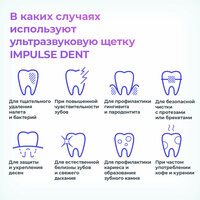 Impulse Dent — электрическая ультразвуковая щетка. Удаляет в 10 раз больше микроорганизмов и частично минерализованных отложений, чем обычная. Чистка зубов ультразвуком не повреждает эмаль, снижает риск образования кариеса и препятствует развитию воспалительных заболеваний полости рта — гингивита, пародонтита.