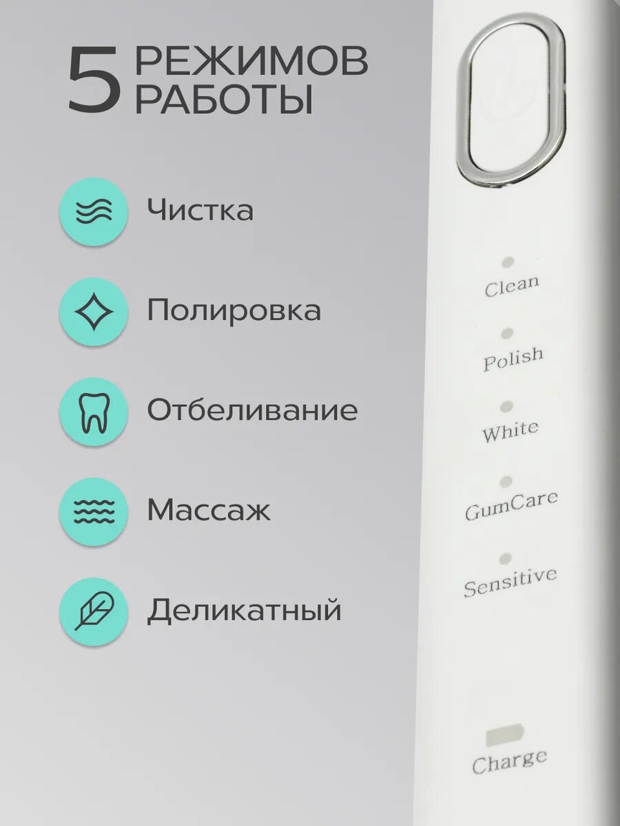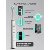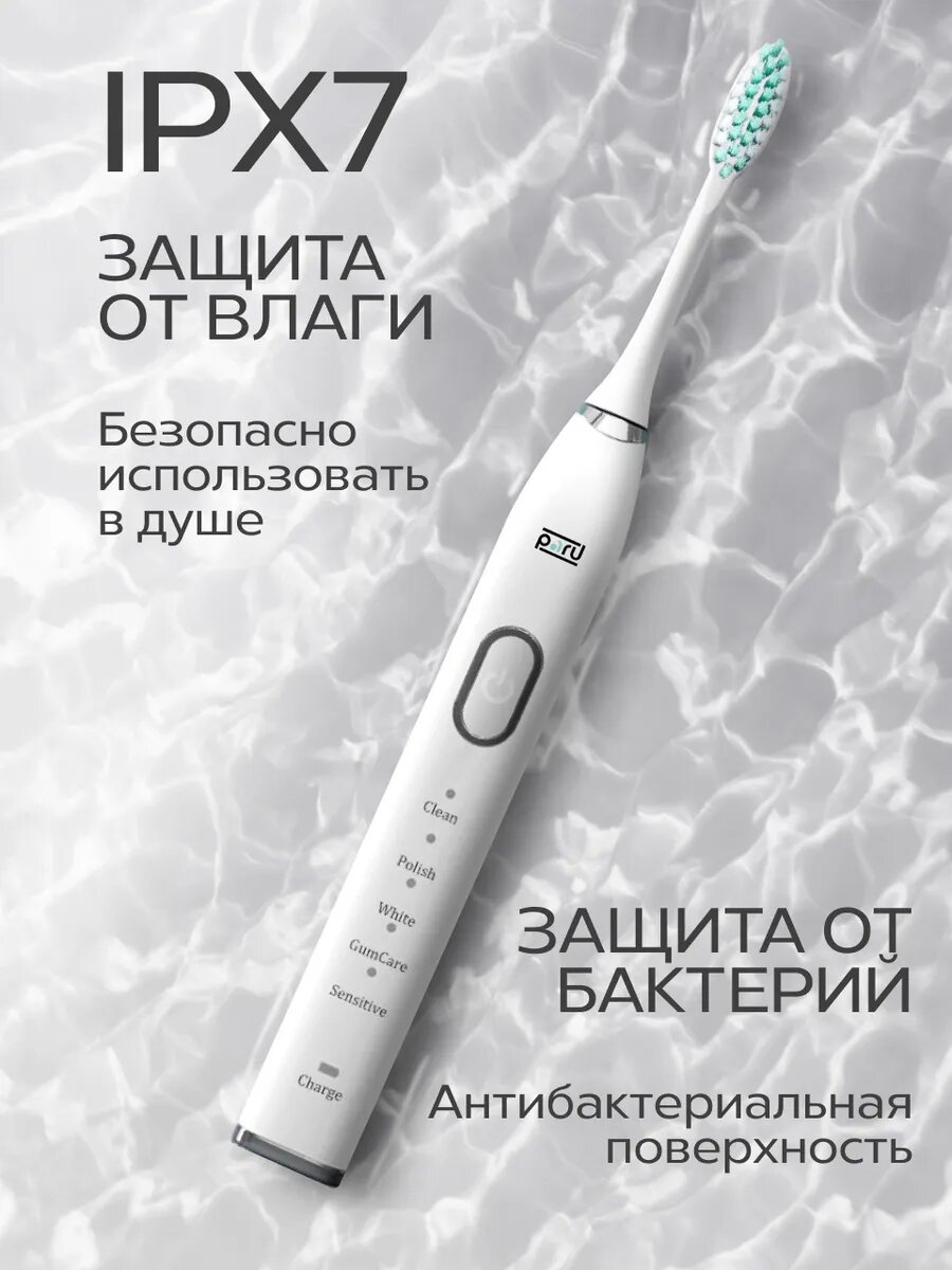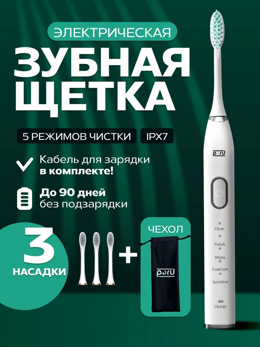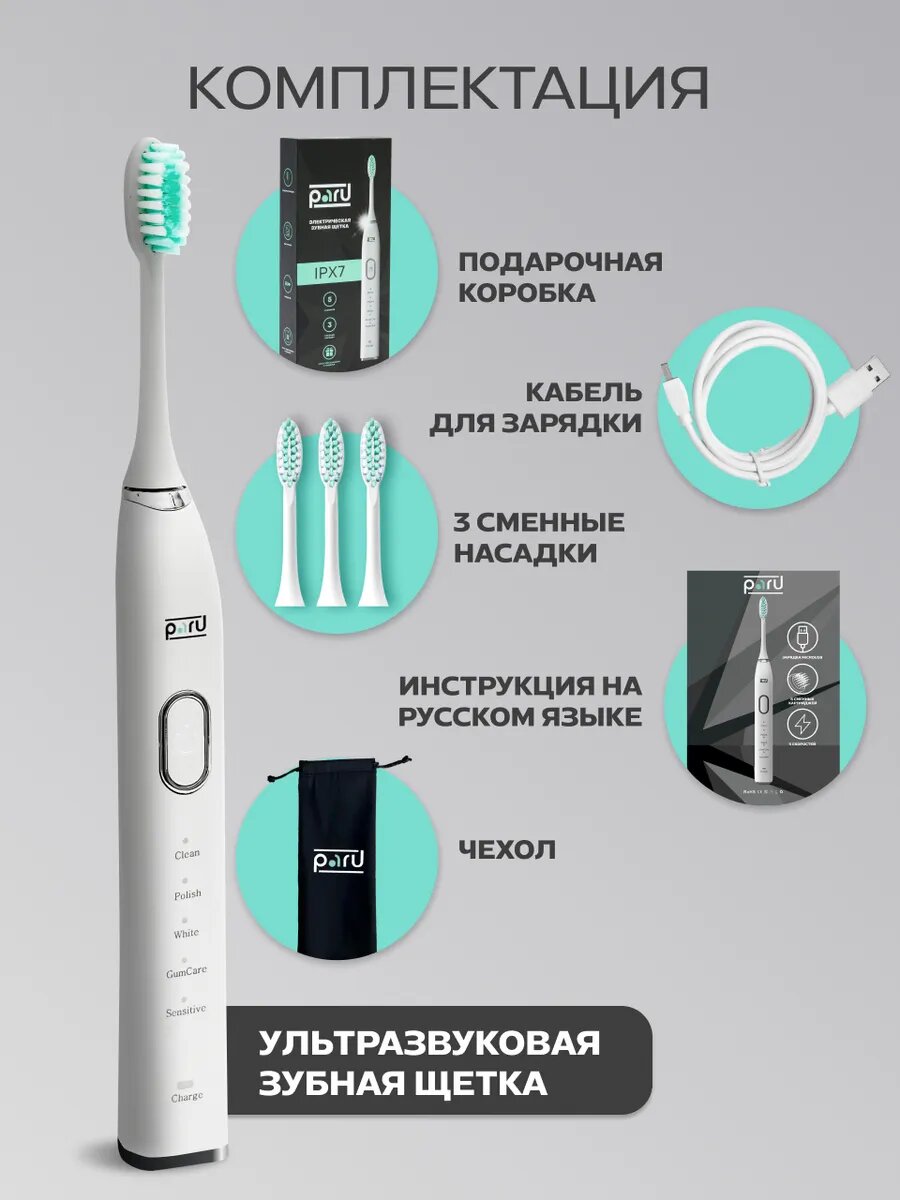 Ультразвуковая зубная щетка взрослая PARU, является устройством для поддержание гигиены полости рта и ухода за деснами и языком. Щетка для зубов имеет 5 режимов работы разной мощности, которые дают возможность выбирать режим под себя. Электрическая зубная щетка взрослая в сравнении с обычной зубной щеткой, в два раза эффективнее. Электрическая щетка для зубов оснащена специальной насадкой с высокой степенью вибрации, за счет этого, всего за несколько минут, можно избавиться от зубного налета и от микрочастиц пищи. В комплекте с современной щеткой идут сразу три насадки. Каждая насадка имеет специальный ворс из стерилизованных щетинок, которые не накапливают микробы и не развивают положительную среду для них. Электронная зубная щетка - основная вещь, которая должна быть у каждого. Гигиена полости рта напрямую зависит от качества зубной щетки. Электро зубная щетка ультразвуковая выполнена в стильном дизайне. В комплекте с устройством есть кабель для зарядки, а также чехол. Зубная шетка мягкая отлично подойдет, если вы отправляетесь в поездку, так как вы легко сможете взять свою любимую зубную щетку с собой. Полной зарядки хватит на два месяца. Зубные щетки электрические дают мощные вибрации и возможность эффективно очистить промежутки между зубов, выполнить массаж десен и языка и почистить зубы под брекетами. Электрощетка зубная обеспечивает бережный уход за зубами, коронками и имплантами без повреждения мягких тканей. Электронная щетка поможет укрепить десна, улучшить кровообращение и предотвратить развитие кариеса. Звуковая зубная щетка имеет пять режимов с звуковыми импульсами до 45 000 вибраций в минуту помогут удалить с зубов застарелый, стойкий налет, при этом будет снижен риск развития зубного камня. Монопучковая щетка электрическая зубная для брекетов PARU, обладает рядом преимуществ: 45000 вибраций в минуту, возможность обработки всей поверхности зуба, снимает застарелый налет, дает возможность проводить массаж десен и языка, пять разных режимов, возможность включить цикл вибраций от сильных к слабым. Ультразвуковая зубная щетка электрическая взрослая оборудована удобной кнопкой питания, на корпусе есть световой индикатор режимов, что позволяет использовать щетку в темноте. Индикатор заряда аккумулятора, наглядно показывает на сколько заряжена зубная электрическая щетка взрослая. Ультразвуковая зубная щетка выполнена из водонепроницаемого корпуса, который имеет антибактериальное покрытие. Электрические зубные щетки мягкие PARU выполнены по стандартам немецкого качества. Комплектующие и корпус устройства имеет степень защиты IPХ7, что дает возможность использовать зубную щетку под струей воды и промывать ее после использования. Перед использованием рекомендуем ознакомиться с инструкцией. Все элементы устройства выполнены из гипоаллергенных материалов, что позволяет использовать щетку людям с повышенной чувствительностью. Щетки зубные имеют анатомическую высоту ворсинок в 6 мм. При использовании автоматической зубной щетки вам будут доступны пять режимов работы: Clean (для глубокого очищения), Polish (для удаления налета с зубов), White (устранение пятен и бактерий), Gumсare (работа в циклическом режиме), Sensitive (бережная очистка). При регулярном использовании зубной щетки уже через неделю вы увидите, как ваши зубы пр
