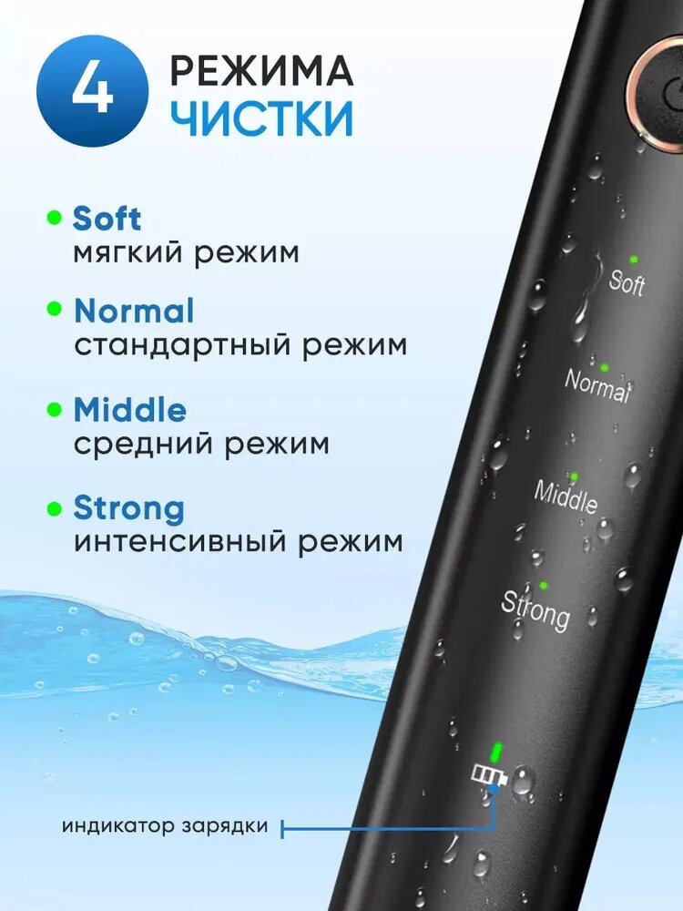 1 Установите в корпус прибора нужную насадку. Плоская насадка используется для удаления крупных камней, налета и пятен с внешней и внутренней стороны зубов. Точечная насадка используется для удаления камней в труднодоступных местах, например зубных промежутках, фиссурах, между эмалью и десной. 2 Нажмите и удерживайте в течение 1,5 секунды кнопку питания , чтобы включить прибор. Загорится подсвет- ка, по умолчанию установлен мягкий режим работы Soft. Примечание: Рекомендуем начинать с мягкого режима, а по мере привыкания увеличивать интенсивность. 3 Короткие последующие нажатия кнопки питания переключают режимы: 1 нажатие - стандартный режим Normal 2 нажатие - средний режим Middle 3 нажатие - интенсивный режим Strong 4. Очистите переднюю поверхность зубов от налета и зубного камня, проведя насадкой влево и вправо, в также вверх и вниз по зубной эмали. Для удаления стойких загрязнений расположите насадку под углом 45° ВНИМАНИЕ! Не прикладывайте чрезмерное давление и не задерживайтесь на одном месте во избежание повреждения эмали. Проводите очистку медленно и в несколько приемов. 5. Очистите фиссуру жевательных зубов. 6. Очистите межзубные промежутки, проводя насадной вверх-вниз несколько раз. 7. Очистите скопившийся налет и зубные камни между эмалью и десной, аккуратно проводя насадной влево и вправо вдоль десны 8. Очистите заднюю поверхность зубов от налета и зубного камня, проведя насадкой влево и вправо, в также вверх и вниз по зубной эмали. Для очистки задней поверхности зубов используйте стоматологическое зеркало из комплекта. 9. По завершении процедуры выключите прибор, удерживая кнопку питания в течение 1,5 секунды. Также прибор имеет автоматическое отключение через 10 минут. 10. Снимите насадку и продезинфицируйте ее в кипящей воде в течение 5 минут или протрите спиртом. Протрите корпус влажной тканью. Затем тщательно высушите все детали прибора.